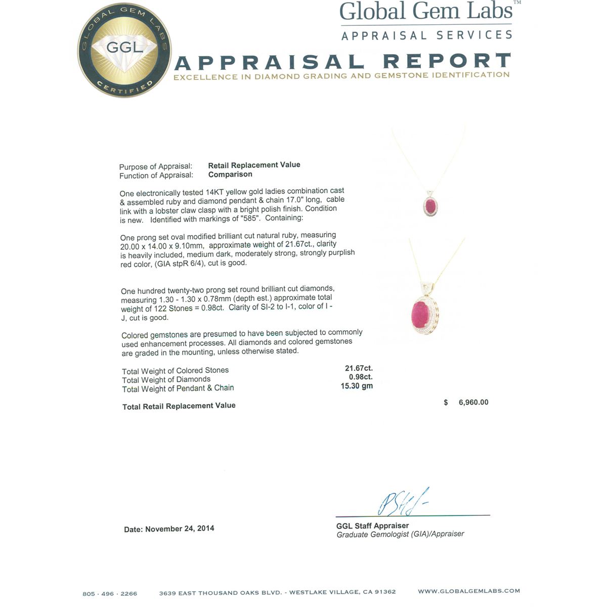 One electronically tested 14KT yellow gold ladies combination cast & assembled ruby and diamond pendant & chain 17.0" long, cable link with a lobster claw clasp with a bright polish finish. Identified with markings of "585". Condition is new. Containing: One prong set oval modified brilliant cut natural ruby, measuring 20.00 x 14.00 x 9.10mm, approximate weight of 21.67ct., clarity is heavily included, medium dark, moderately strong, strongly purplish red color, (GIA stpR 6/4), cut is good. One Hundred Twenty-Two prong set round brilliant cut diamonds, measuring 1.30 - 1.30 x 0.78mm (depth est.) approximate total weight of 122 Stones = 0.98ct. Clarity: SI-2 to I-1. Color: I - J, Cut is Good. Colored gemstones are presumed to have been subjected to commonly used enhancement processes. All diamonds and colored gemstones are graded in the mounting, unless otherwise stated. Total Weight of Colored Stones 21.67ct. Total Weight of Diamonds 0.98ct. Total Weight of Pendant & Chain 15.30 grams. GGL Appraised at $6,960.00.