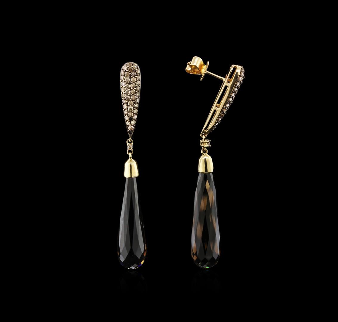 One pair of earrings featuring: 14KT yellow gold weighing 4.27 grams containing two smokey quartz with a total weight of 22.00ct and 76 brown diamonds with a total weight of 1.16ct.