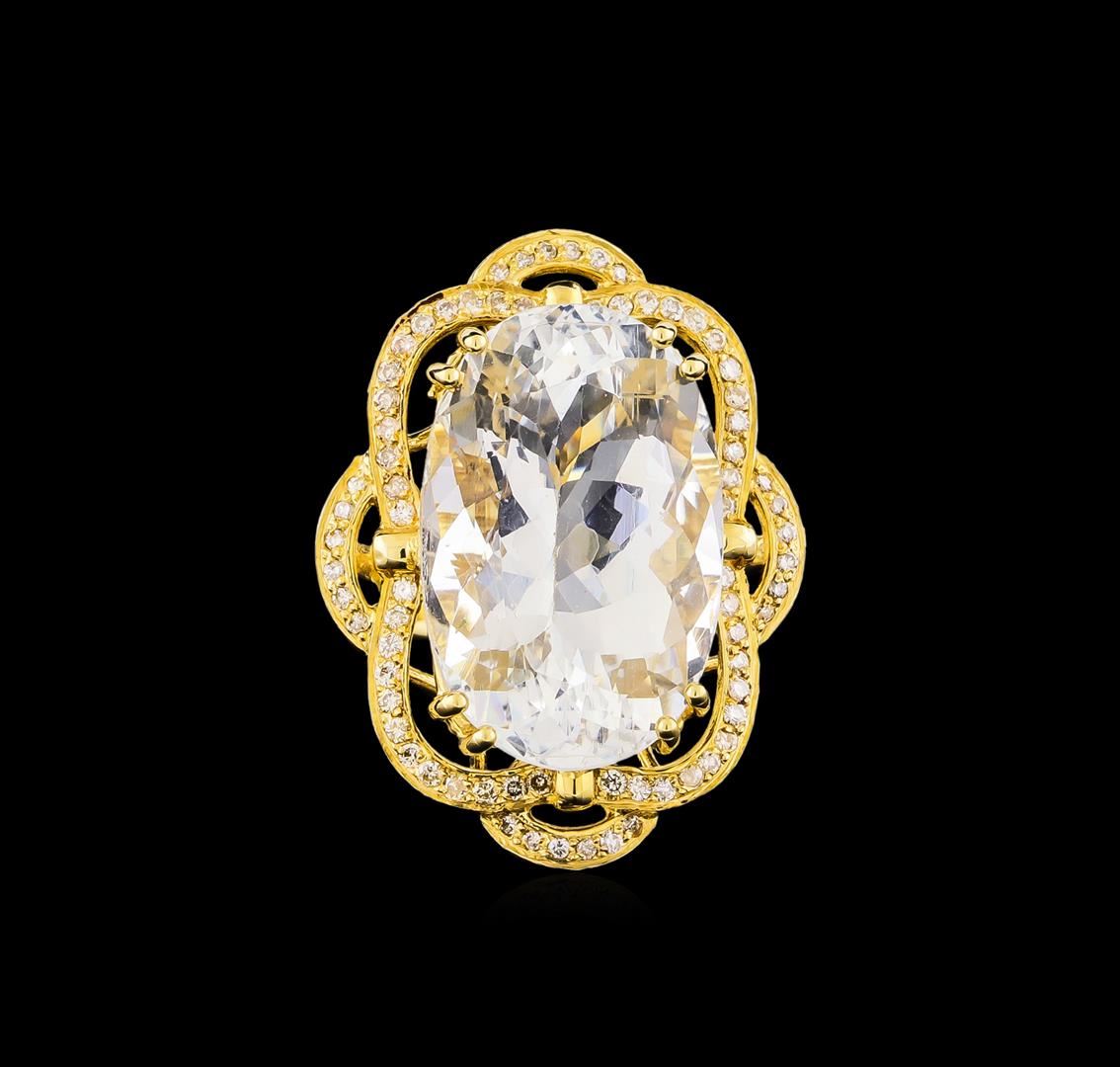 One electronically tested 14KT yellow gold Ladies combination cast & assembled ring with a bright polish finish. Condition is new. Identified with markings of "K14". Containing: One prong set oval modified brilliant cut natural aquamarine, measuring 23.24 x 15.17 x 11.00mm, approximate weight of 22.07ct., clarity is eye clean, type I, very light, very slightly grayish, blue color, (GIA B 2/3), cut is good. Seventy-Two prong set round brilliant cut diamonds, measuring 1.30 - 1.30 x 0.78mm (depth est.) approximate. Total Weight of 72 Stones = 0.58ct. Clarity: SI-2 to I-2. Color: J - K, Cut is Good. Colored gemstones are presumed to have been subjected to commonly used enhancement processes. All diamonds and colored gemstones are graded in the mounting, unless otherwise stated. Total Weight of Colored Stones 22.07ct. Total Weight of Diamonds 0.58ct. Total Weight of Ring 13.40 grams. GGL Appraised at $9,540.00.