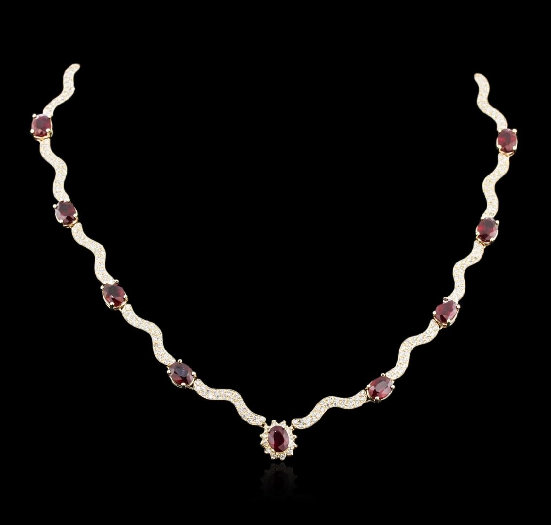 One electronically tested 14KT yellow gold ladies cast ruby and diamond necklace with a hidden box clasp with safety closer with a bright polish finish. Measurements: 18" in length Identified with markings of "14K". Condition is new. Containing: Thirteen prong set oval modified brilliant cut natural rubies, measuring 8.00 x 6.20 x 4.03mm, approximate total weight of 22.10ct., clarity is heavily included, medium dark, very slightly brownish, strongly purplish red color, (GIA stpR 6/3), cut is good. Three Hundred Thirty-Four prong set round brilliant cut diamonds, measuring 1.50 - 1.50 x 0.90mm (depth est.) approximate total weight of 334 Stones = 4.11ct. Clarity: SI-1 to SI-2. Color: I - J, Cut is Good. Colored gemstones are presumed to have been subjected to commonly used enhancement processes. All diamonds and colored gemstones are graded in the mounting, unless otherwise stated. Total Weight of Colored Stones 22.10ct. Total Weight of Diamonds 4.11ct. Total Weight of Necklace 35.70 grams. GGL Appraised at $15,465.00.