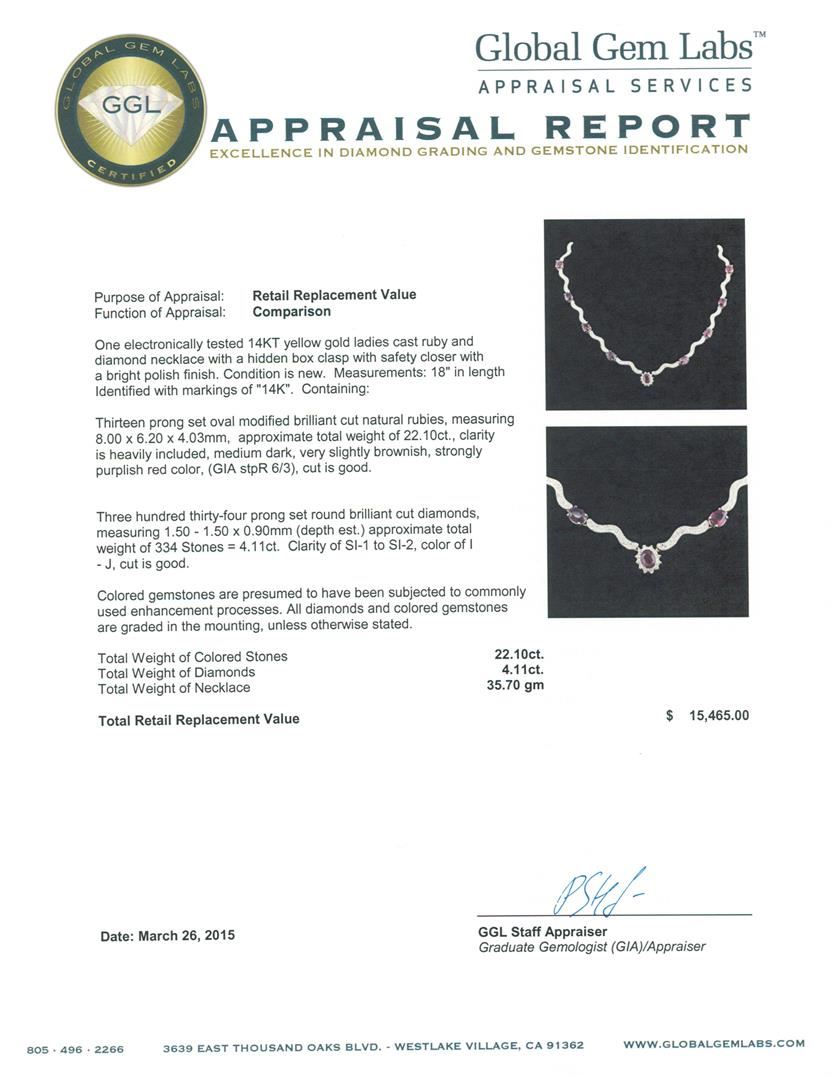 One electronically tested 14KT yellow gold ladies cast ruby and diamond necklace with a hidden box clasp with safety closer with a bright polish finish. Measurements: 18" in length Identified with markings of "14K". Condition is new. Containing: Thirteen prong set oval modified brilliant cut natural rubies, measuring 8.00 x 6.20 x 4.03mm, approximate total weight of 22.10ct., clarity is heavily included, medium dark, very slightly brownish, strongly purplish red color, (GIA stpR 6/3), cut is good. Three Hundred Thirty-Four prong set round brilliant cut diamonds, measuring 1.50 - 1.50 x 0.90mm (depth est.) approximate total weight of 334 Stones = 4.11ct. Clarity: SI-1 to SI-2. Color: I - J, Cut is Good. Colored gemstones are presumed to have been subjected to commonly used enhancement processes. All diamonds and colored gemstones are graded in the mounting, unless otherwise stated. Total Weight of Colored Stones 22.10ct. Total Weight of Diamonds 4.11ct. Total Weight of Necklace 35.70 grams. GGL Appraised at $15,465.00.