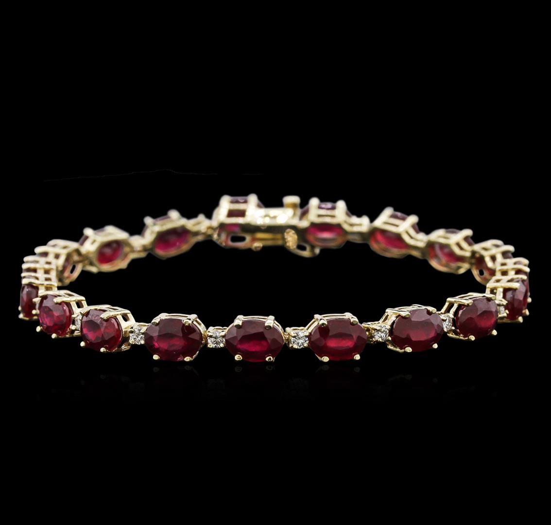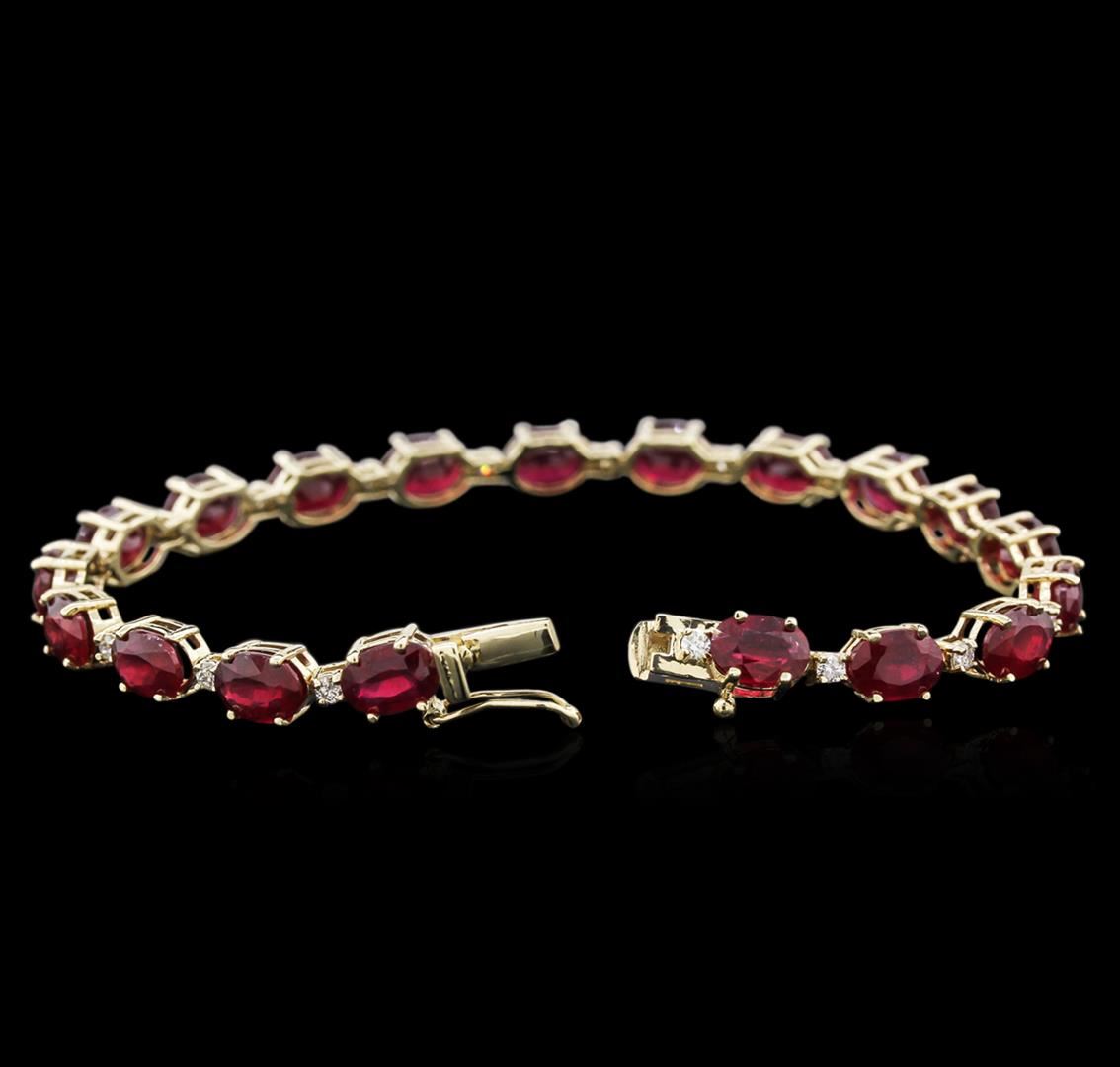 One electronically tested 14KT yellow gold ladies cast ruby and diamond bracelet with a hidden box clasp with safety closer with a bright polish finish. Measurements: 7" in length Identified with markings of "14K". Condition is new. Containing: Nineteen prong set oval modified brilliant cut natural rubies, measuring 7.00 x 5.00 x 3.25mm, approximate total weight of 22.57ct., clarity is heavily included, type II, medium, very slightly brownish, slightly purplish red color, (GIA slpR 5/3), cut is good. Nineteen prong set round brilliant cut diamonds, measuring 1.30 - 1.30 x 0.78mm (depth est.) approximate total weight of 19 Stones = 0.67ct. Clarity: SI-1 to SI-2. Color: I - J, Cut is Good. Colored gemstones are presumed to have been subjected to commonly used enhancement processes. All diamonds and colored gemstones are graded in the mounting, unless otherwise stated. Total Weight of Colored Stones 22.57ct. Total Weight of Diamonds 0.67ct. Total Weight of Bracelet 13.10 grams. GGL Appraised at $4,455.00.