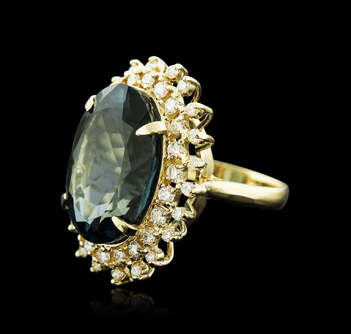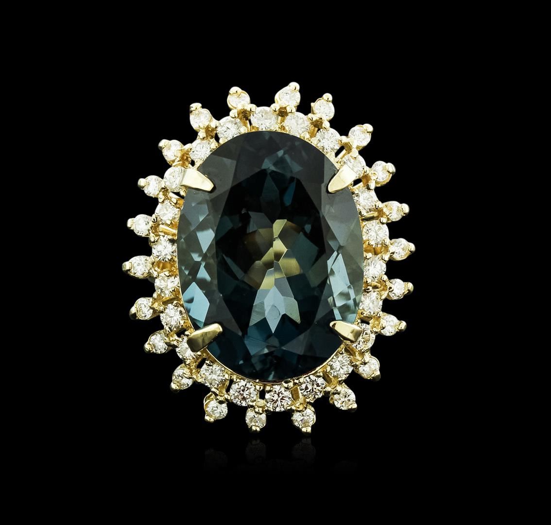 One electronically tested 14KT yellow gold ladies cast topaz and diamond ring with a bright polish finish. Identified with markings of "14K". Condition is new. Containing: One prong set oval modified brilliant cut natural blue topaz, measuring 19.82 x 15.00 x 10.30mm, approximate weight of 22.70ct., clarity is eye clean, type I, medium, moderately strong, greenish blue color, (GIA gB 5/4), cut is good. Forty-Four prong set round brilliant cut diamonds, measuring 2.00 - 1.40 x 1.02mm (depth est.) approximate total weight of 44 Stones = 0.79ct. Clarity: SI-1 to I-1. Color: J - K, Cut is Good. Colored gemstones are presumed to have been subjected to commonly used enhancement processes. All diamonds and colored gemstones are graded in the mounting, unless otherwise stated. Total Weight of Colored Stones 22.70ct. Total Weight of Diamonds 0.79ct. Total Weight of Ring 12.70 grams. GGL Appraised at $4,490.00.