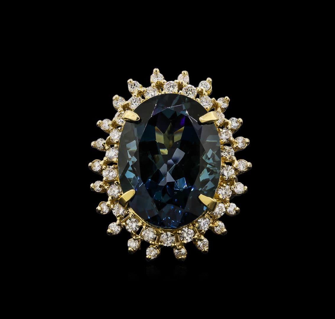 One electronically tested 14KT yellow gold ladies cast topaz and diamond ring with a bright polish finish. Identified with markings of "14K". Condition is new. Containing: One prong set oval modified brilliant cut natural blue topaz, measuring 19.82 x 15.00 x 10.30mm, approximate weight of 22.70ct., clarity is eye clean, type I, medium, moderately strong, greenish blue color, (GIA gB 5/4), cut is good. Forty-Four prong set round brilliant cut diamonds, measuring 2.00 - 1.40 x 1.02mm (depth est.) approximate total weight of 44 Stones = 0.79ct. Clarity: SI-1 to I-1. Color: J - K, Cut is Good. Colored gemstones are presumed to have been subjected to commonly used enhancement processes. All diamonds and colored gemstones are graded in the mounting, unless otherwise stated. Total Weight of Colored Stones 22.70ct. Total Weight of Diamonds 0.79ct. Total Weight of Ring 12.70 grams. GGL Appraised.