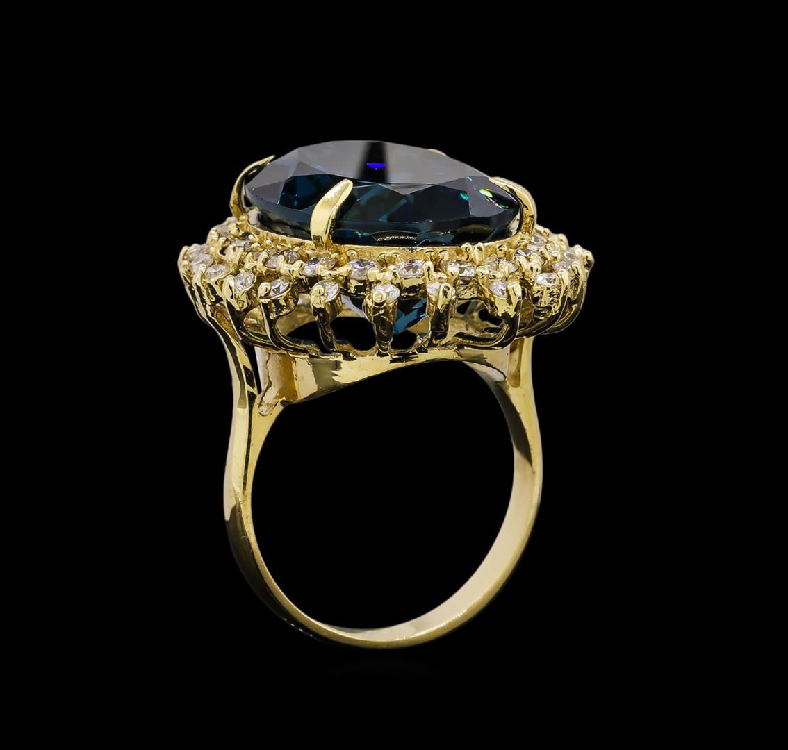 One electronically tested 14KT yellow gold ladies cast topaz and diamond ring with a bright polish finish. Identified with markings of "14K". Condition is new. Containing: One prong set oval modified brilliant cut natural blue topaz, measuring 19.82 x 15.00 x 10.30mm, approximate weight of 22.70 ct., clarity is eye clean, type I, medium, moderately strong, greenish blue color, (GIA gB 5/4), cut is good. Forty-Four prong set round brilliant cut diamonds, measuring 2.00 - 1.40 x 1.02mm (depth est.) approximate total weight of 44 Stones = 0.79ct. Clarity: SI-1 to I-1. Color: J - K, Cut is Good. Colored gemstones are presumed to have been subjected to commonly used enhancement processes. All diamonds and colored gemstones are graded in the mounting, unless otherwise stated. Total Weight of Colored Stones 22.70 ct. Total Weight of Diamonds 0.79ct. Total Weight of Ring 12.70 grams. GGL Appraised.