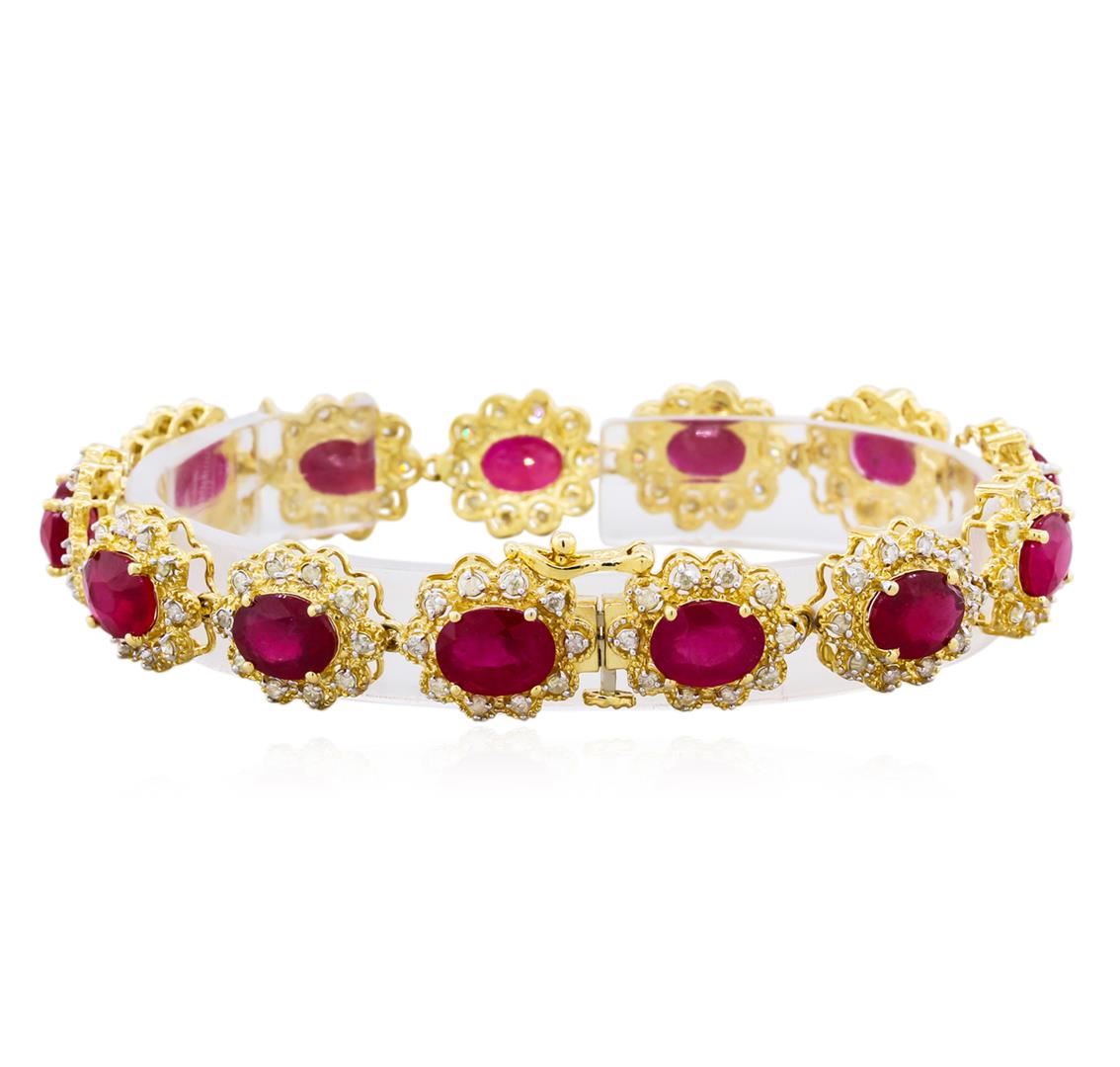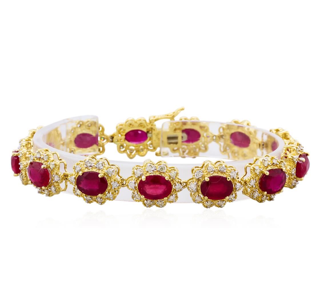 One electronically tested 14KT yellow gold ladies cast & assembled ruby and diamond bracelet. Seven and one-half inch length bracelet features a flexible ruby and diamond floret ribbon, terminating in a concealed clasp with safety. Bright polish finish with milgrain detailing and rhodium accents. Identified with markings of "14K". Condition is new, good workmanship. Containing: Thirteen prong set oval mixed cut natural rubies approximate. Total Weight of 22.90ct., clarity is heavily included, type II, dark, very slightly brownish, slightly purplish red color, (GIA slpR 7/3), cut is good. Transmitting light somewhat diffusely, transparent to translucent. Naturally occurring internal & external characteristics are present. Indicationsof laboratory high temperature heat treatment, with glass & flux additives. Color grade is anaverage for the group. Graded in the setting. Ruby has a low tolerance to rhodium plating,repolishing the surface, & ultrasonic cleaning.One Hundred Thirty prong set round brilliant cut diamonds (depth est.) approximate. Total Weight of 130 Stones = 2.16ct. Graded in the setting. Clarity: I-1 to I-2. Color: I - K. Total Weight of Colored Stones 22.90ct. Total Weight of Diamonds 2.16ct. Total Weight of Bracelet 20.28gm. AIG Appraised at $10,750.00.