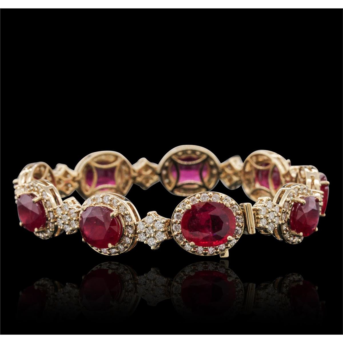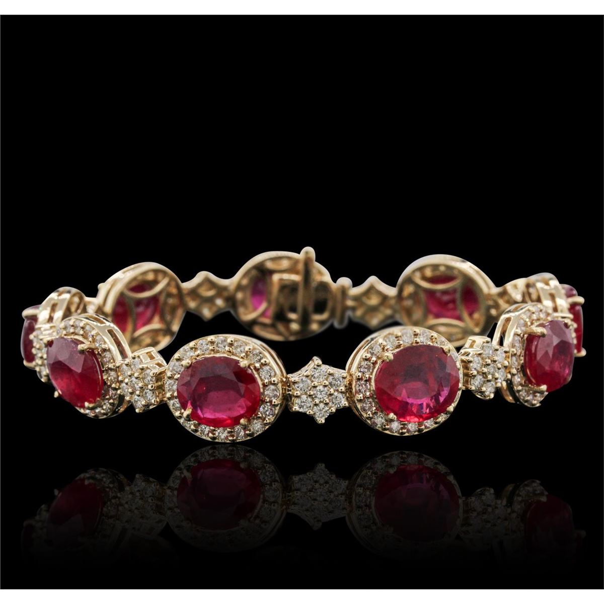 One electronically tested 14KT yellow gold ladies combination cast & assembled ruby and diamond bracelet with a hidden box clasp with safety closer with a bright polish finish. Measurements: 7.25" in length. Identified with markings of "14K". Condition is new. Containing: Nine prong set oval modified brilliant cut natural rubies, measuring 9.91 x 8.07 x 3.94mm, approximate total weight of 22.95ct., clarity is heavily included, type II, medium, moderately strong, strongly purplish red color, (GIA stpR 5/4), cut is very good. Two Hundred Seven prong set round brilliant cut diamonds, measuring 1.60 - 1.30 x 0.87mm (depth est.) approximate total weight of 207 Stones = 2.30ct. Clarity: SI-2 to I-2. Color: H - I, Cut is Good. Colored gemstones are presumed to have been subjected to commonly used enhancement processes. All diamonds and colored gemstones are graded in the mounting, unless otherwise stated. Total Weight of Colored Stones 22.95ct. Total Weight of Diamonds 2.30ct. Total Weight of Bracelet 29.90 grams. GGL Appraised at $22,300.00.