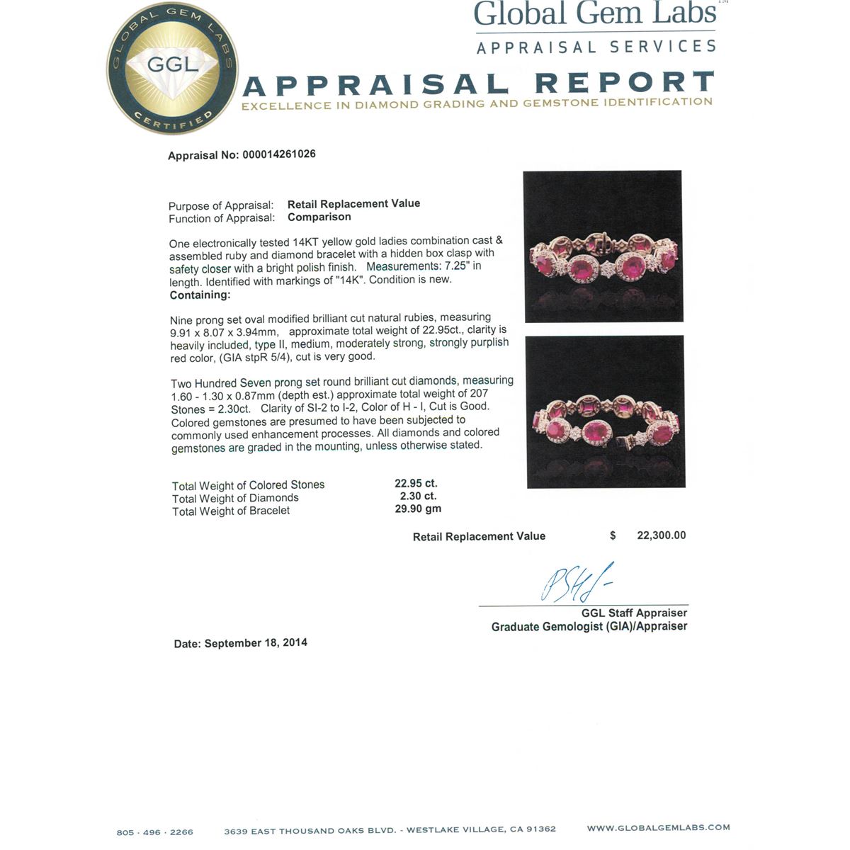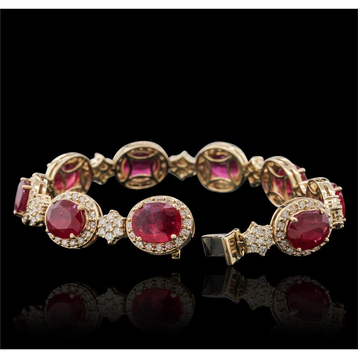 One electronically tested 14KT yellow gold ladies combination cast & assembled ruby and diamond bracelet with a hidden box clasp with safety closer with a bright polish finish. Measurements: 7.25" in length. Identified with markings of "14K". Condition is new. Containing: Nine prong set oval modified brilliant cut natural rubies, measuring 9.91 x 8.07 x 3.94mm, approximate total weight of 22.95ct., clarity is heavily included, type II, medium, moderately strong, strongly purplish red color, (GIA stpR 5/4), cut is very good. Two Hundred Seven prong set round brilliant cut diamonds, measuring 1.60 - 1.30 x 0.87mm (depth est.) approximate total weight of 207 Stones = 2.30ct. Clarity: SI-2 to I-2. Color: H - I, Cut is Good. Colored gemstones are presumed to have been subjected to commonly used enhancement processes. All diamonds and colored gemstones are graded in the mounting, unless otherwise stated. Total Weight of Colored Stones 22.95ct. Total Weight of Diamonds 2.30ct. Total Weight of Bracelet 29.90 grams. GGL Appraised at $22,300.00.