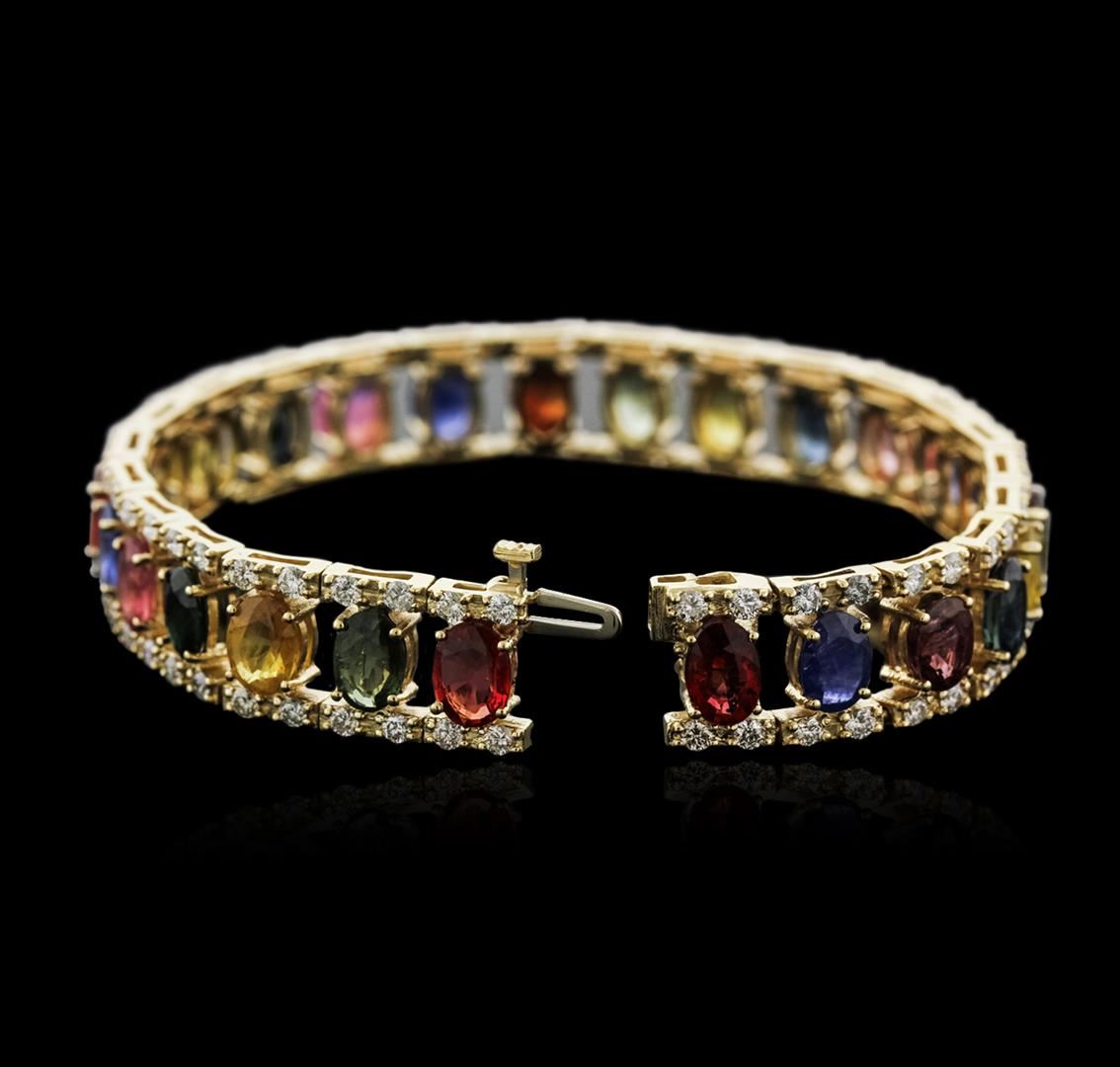 One electronically tested 14KT yellow gold ladies cast sapphire and diamond bracelet with a hidden box clasp with a bright polish finish. Measurements: 7" in length Identified with markings of "14K". Condition is new. Containing: Twenty-five prong set oval modified brilliant cut natural multicolor sapphires, measuring 6.80 x 5.00 x 3.25mm, approximate total weight of 23.25ct., clarity is slightly included, type II, medium light, moderately strong, violet color, (GIA V 4/4), cut is good. One Hundred prong set round brilliant cut diamonds, measuring 1.80 - 1.80 x 1.08mm (depth est.) approximate total weight of 100 Stones = 2.13ct. Clarity: SI-1 to I-1. Color: H - I, Cut is Good. Colored gemstones are presumed to have been subjected to commonly used enhancement processes. All diamonds and colored gemstones are graded in the mounting, unless otherwise stated. Total Weight of Colored Stones 23.25ct. Total Weight of Diamonds 2.13ct. Total Weight of Bracelet 27.90 grams. GGL Appraised at $13,585.00.