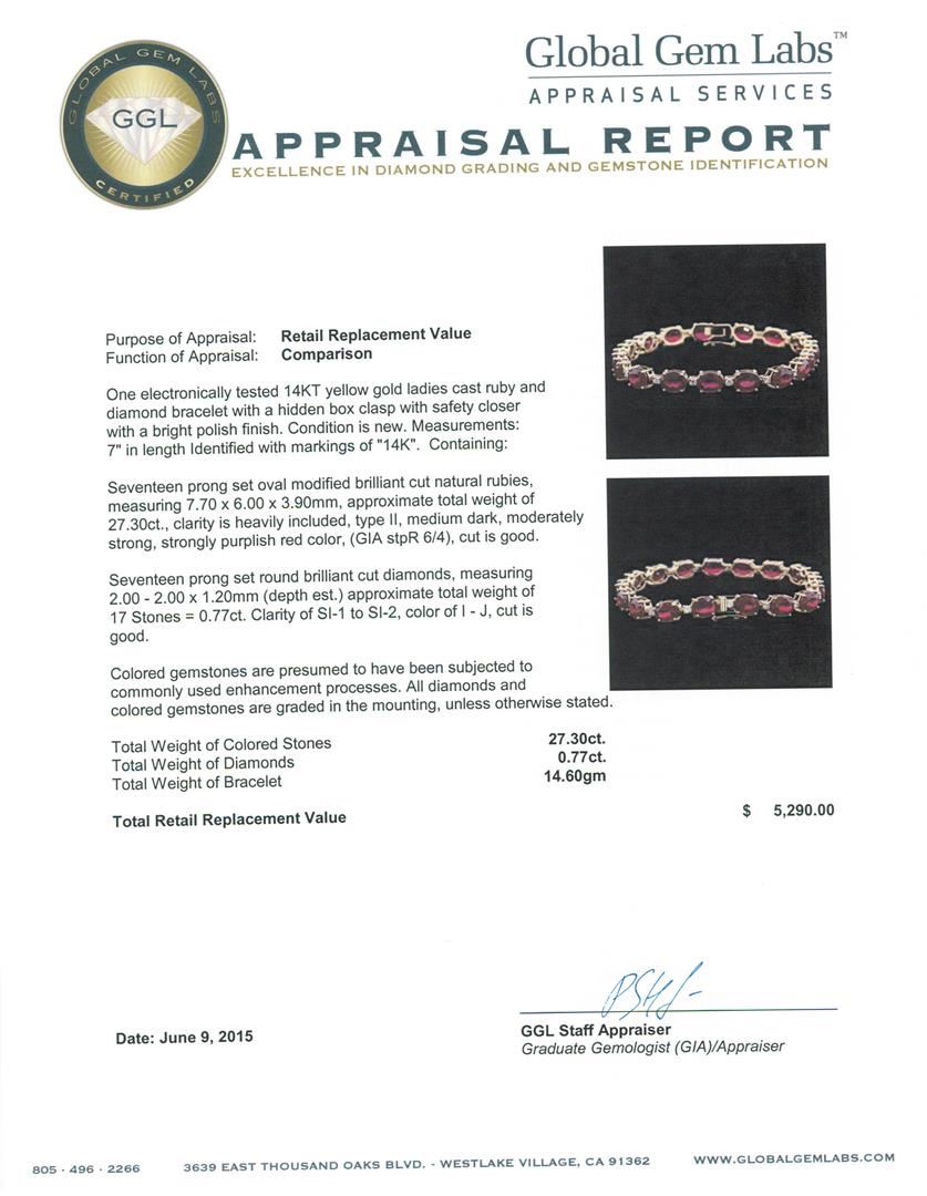 One electronically tested 14KT yellow gold ladies cast ruby and diamond bracelet with a hidden box clasp with safety closer with a bright polish finish. Measurements: 7" in length Identified with markings of "14K". Condition is new. Containing: Seventeen prong set oval modified brilliant cut natural rubies, measuring 7.70 x 6.00 x 3.90mm, approximate total weight of 27.30ct., clarity is heavily included, type II, medium dark, moderately strong, strongly purplish red color, (GIA stpR 6/4), cut is good. Seventeen prong set round brilliant cut diamonds, measuring 2.00 - 2.00 x 1.20mm (depth est.) approximate total weight of 17 Stones = 0.77ct. Clarity: SI-1 to SI-2. Color: I - J, Cut is Good. Colored gemstones are presumed to have been subjected to commonly used enhancement processes. All diamonds and colored gemstones are graded in the mounting, unless otherwise stated. Total Weight of Colored Stones 27.30ct. Total Weight of Diamonds 0.77ct. Total Weight of Bracelet 14.60 grams. GGL Appraised at $5,290.00.