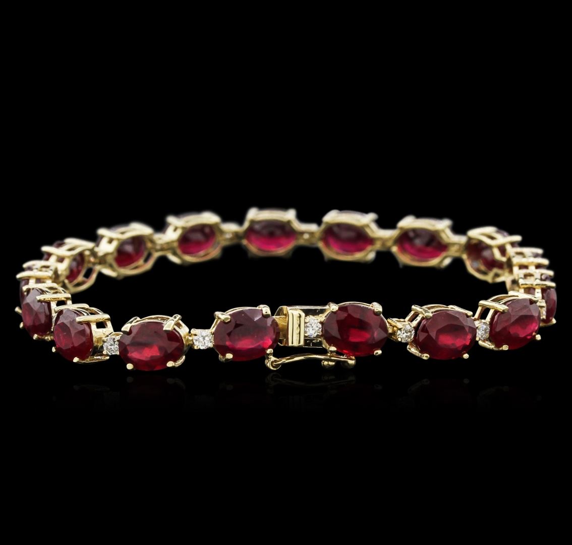 One electronically tested 14KT yellow gold ladies cast ruby and diamond bracelet with a hidden box clasp with safety closer with a bright polish finish. Measurements: 7" in length Identified with markings of "14K". Condition is new. Containing: Seventeen prong set oval modified brilliant cut natural rubies, measuring 7.70 x 6.00 x 3.90mm, approximate total weight of 27.30ct., clarity is heavily included, type II, medium dark, moderately strong, strongly purplish red color, (GIA stpR 6/4), cut is good. Seventeen prong set round brilliant cut diamonds, measuring 2.00 - 2.00 x 1.20mm (depth est.) approximate total weight of 17 Stones = 0.77ct. Clarity: SI-1 to SI-2. Color: I - J, Cut is Good. Colored gemstones are presumed to have been subjected to commonly used enhancement processes. All diamonds and colored gemstones are graded in the mounting, unless otherwise stated. Total Weight of Colored Stones 27.30ct. Total Weight of Diamonds 0.77ct. Total Weight of Bracelet 14.60 grams. GGL Appraised at $5,290.00.