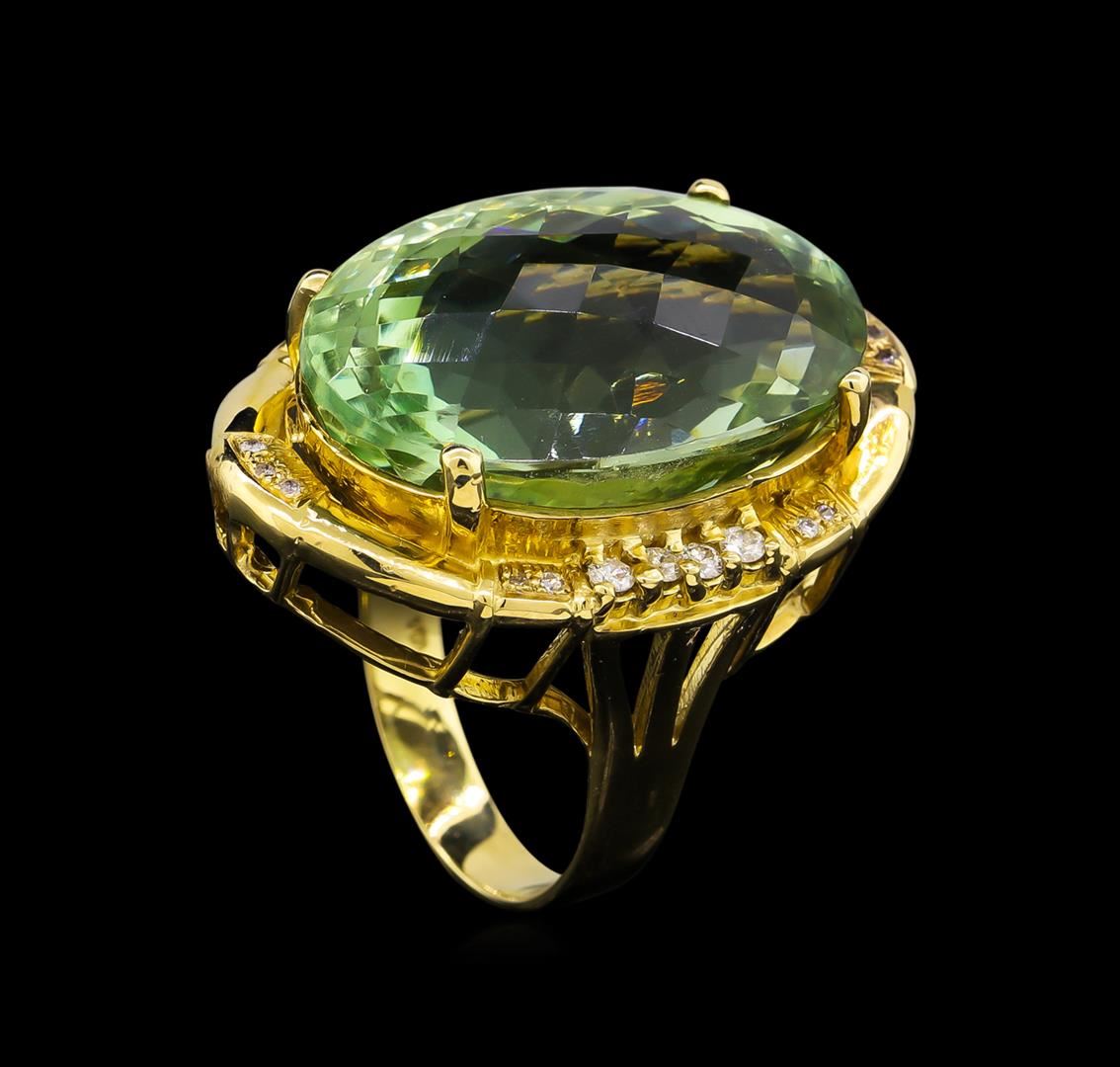 One electronically tested 14KT yellow gold ladies cast green quartz and diamond ring with a bright polish finish. Condition is new, good workmanship. The featured green quartz is set within a diamond bezel, supported by split shoulders and completed by a three and one-half millimeter wide band. Identified with markings of "K14". Containing: One prong set oval mixed cut natural green quartz, measuring 23.30 x 15.80 x 12.50mm, 8%. bulge factor, approximate weight of 27.45ct., clarity is eye clean, medium, very slightly grayish, very slightly bluish green color, (GIA vslbG 5/3), cut is good. Transmitting light with no distortion, transparent. Colored Stone Grading Report attached. Graded in the setting Eight prong set round brilliant cut diamonds, measuring 2.00 - 1.90 x 1.17mm (depth est.) approximate total weight of 8 Stones = 0.31ct. Graded in the setting. Clarity: I-1 to I-2 . Color: G - I Fourteen bead set round brilliant cut diamonds, measuring 1.10 - 1.00 x 0.63mm (depth est.) approximate total weight of 14 Stones = 0.60ct. Graded in the setting. Clarity: I-2 to I-3 . Color: G - I. Total Weight of Colored Stones 27.45ct. Total Weight of Diamonds 0.91ct. Total Weight of Ring 13.80 grams. AIG Appraised at $4,105.00.
