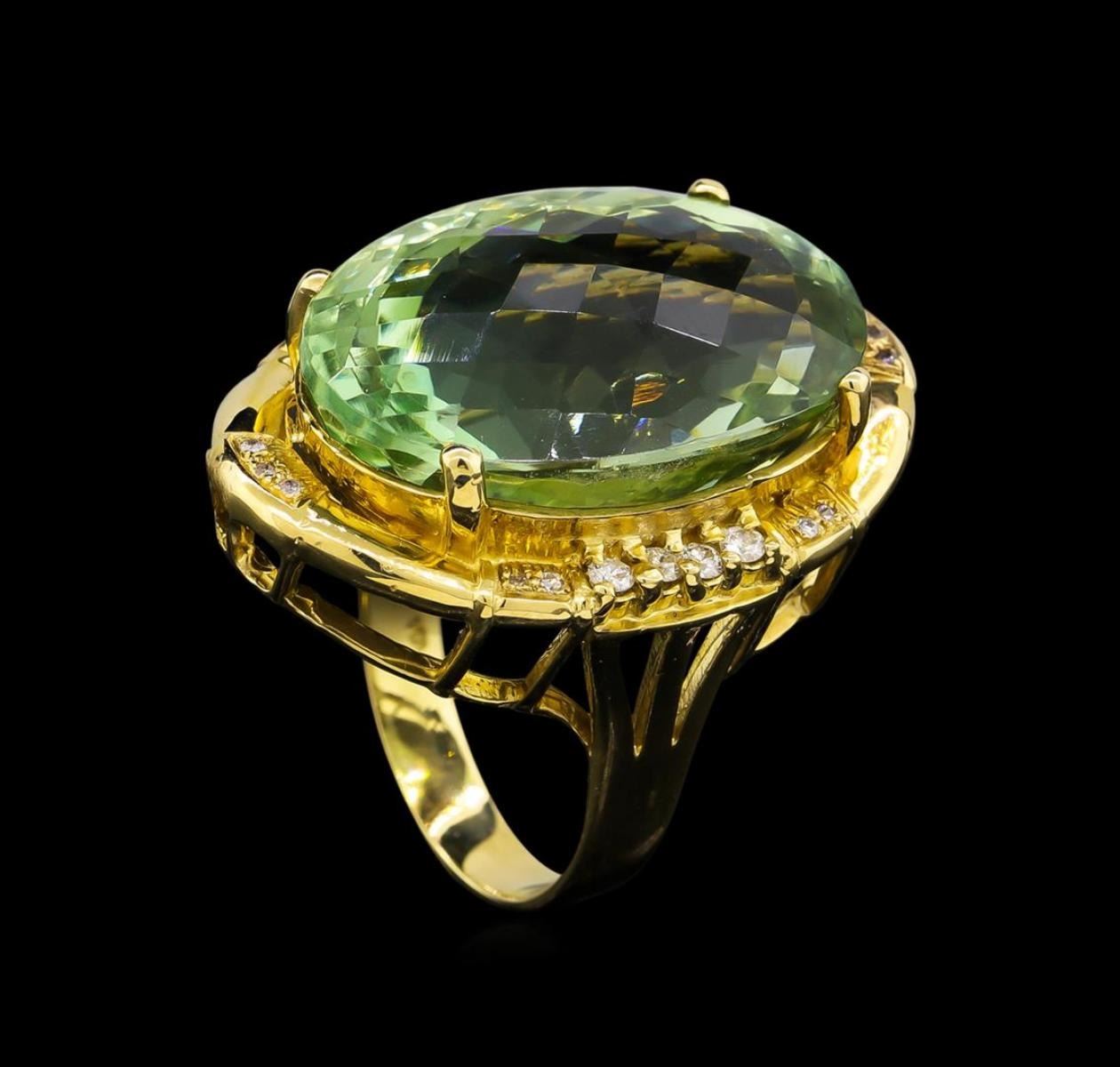 One electronically tested 14KT yellow gold ladies cast green quartz and diamond ring with a bright polish finish. Condition is new, good workmanship. The featured green quartz is set within a diamond bezel, supported by split shoulders and completed by a three and one-half millimeter wide band. Identified with markings of "K14". Containing: One prong set oval mixed cut natural green quartz, measuring 23.30 x 15.80 x 12.50mm, 8%. bulge factor, approximate weight of 27.45ct., clarity is eye clean, medium, very slightly grayish, very slightly bluish green color, (GIA vslbG 5/3), cut is good. Transmitting light with no distortion, transparent. Colored Stone Grading Report attached. Graded in the setting Eight prong set round brilliant cut diamonds, measuring 2.00 - 1.90 x 1.17mm (depth est.) approximate total weight of 8 Stones = 0.31ct. Graded in the setting. Clarity: I-1 to I-2 . Color: G - I Fourteen bead set round brilliant cut diamonds, measuring 1.10 - 1.00 x 0.63mm (depth est.) approximate total weight of 14 Stones = 0.60 ct. Graded in the setting. Clarity: I-2 to I-3 . Color: G - I. Total Weight of Colored Stones 27.45ct. Total Weight of Diamonds 0.91ct. Total Weight of Ring 13.80 grams. AIG Appraised.