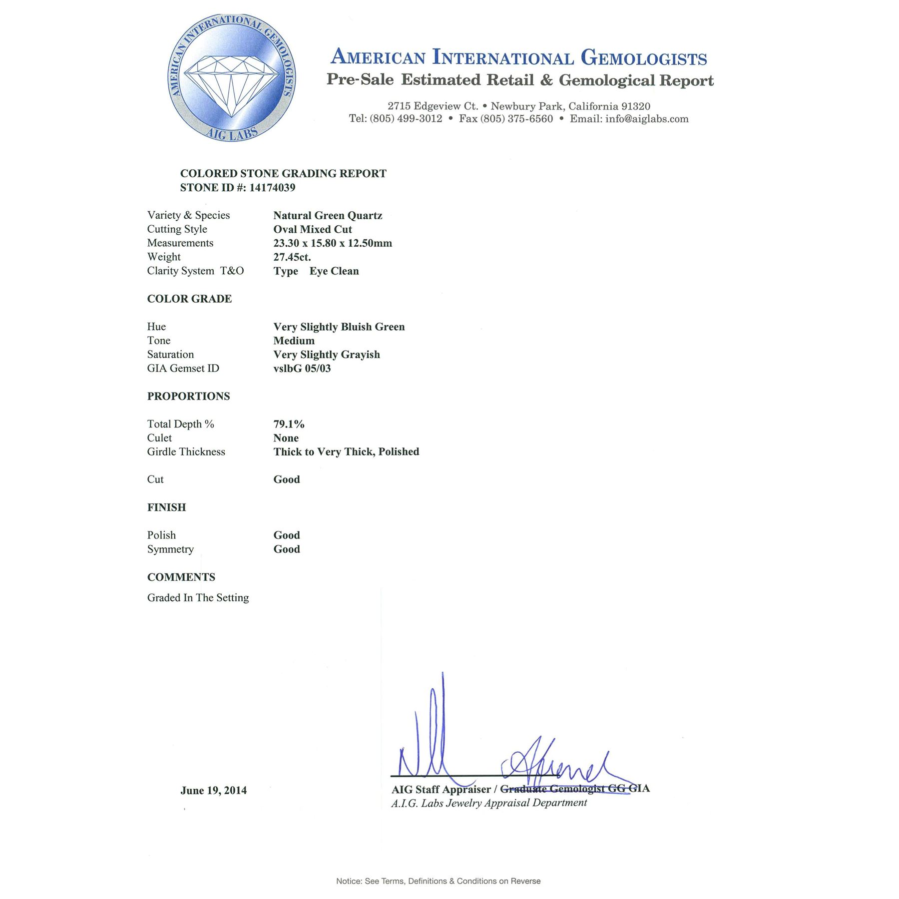 One electronically tested 14KT yellow gold ladies cast green quartz and diamond ring with a bright polish finish. Condition is new, good workmanship. The featured green quartz is set within a diamond bezel, supported by split shoulders and completed by a three and one-half millimeter wide band. Identified with markings of "K14". Containing: One prong set oval mixed cut natural green quartz, measuring 23.30 x 15.80 x 12.50mm, 8%. bulge factor, approximate weight of 27.45ct., clarity is eye clean, medium, very slightly grayish, very slightly bluish green color, (GIA vslbG 5/3), cut is good. Transmitting light with no distortion, transparent. Colored Stone Grading Report attached. Graded in the setting Eight prong set round brilliant cut diamonds, measuring 2.00 - 1.90 x 1.17mm (depth est.) approximate total weight of 8 Stones = 0.31ct. Graded in the setting. Clarity: I-1 to I-2 . Color: G - I Fourteen bead set round brilliant cut diamonds, measuring 1.10 - 1.00 x 0.63mm (depth est.) approximate total weight of 14 Stones = 0.60 ct. Graded in the setting. Clarity: I-2 to I-3 . Color: G - I. Total Weight of Colored Stones 27.45ct. Total Weight of Diamonds 0.91ct. Total Weight of Ring 13.80 grams. AIG Appraised.