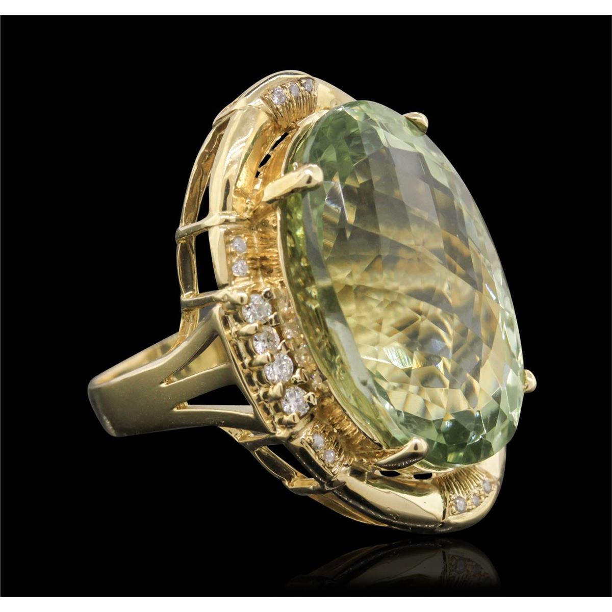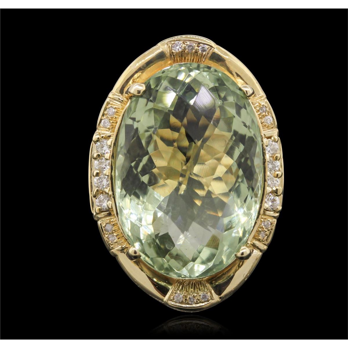 One electronically tested 14KT yellow gold ladies cast green quartz and diamond ring with a bright polish finish. Condition is new, good workmanship. The featured green quartz is set within a diamond bezel, supported by split shoulders and completed by a three and one-half millimeter wide band. Identified with markings of "K14". Containing: One prong set oval mixed cut natural green quartz, measuring 23.30 x 15.80 x 12.50mm, 8%. bulge factor, approximate weight of 27.45ct., clarity is eye clean, medium, very slightly grayish, very slightly bluish green color, (GIA vslbG 5/3), cut is good. Transmitting light with no distortion, transparent. Colored Stone Grading Report attached. Graded in the setting Eight prong set round brilliant cut diamonds, measuring 2.00 - 1.90 x 1.17mm (depth est.) approximate total weight of 8 Stones = 0.31ct. Graded in the setting. Clarity: I-1 to I-2 . Color: G - I Fourteen bead set round brilliant cut diamonds, measuring 1.10 - 1.00 x 0.63mm (depth est.) approximate total weight of 14 Stones = 0.60ct. Graded in the setting. Clarity: I-2 to I-3 . Color: G - I. Total Weight of Colored Stones 27.45ct. Total Weight of Diamonds 0.91ct. Total Weight of Ring 13.80 grams. AIG Appraised at $4,105.00.