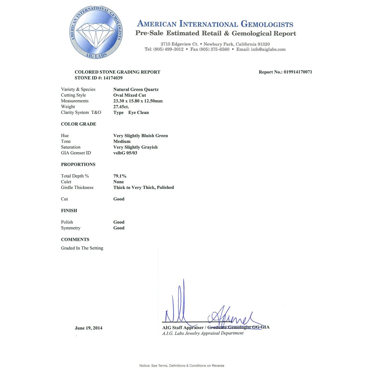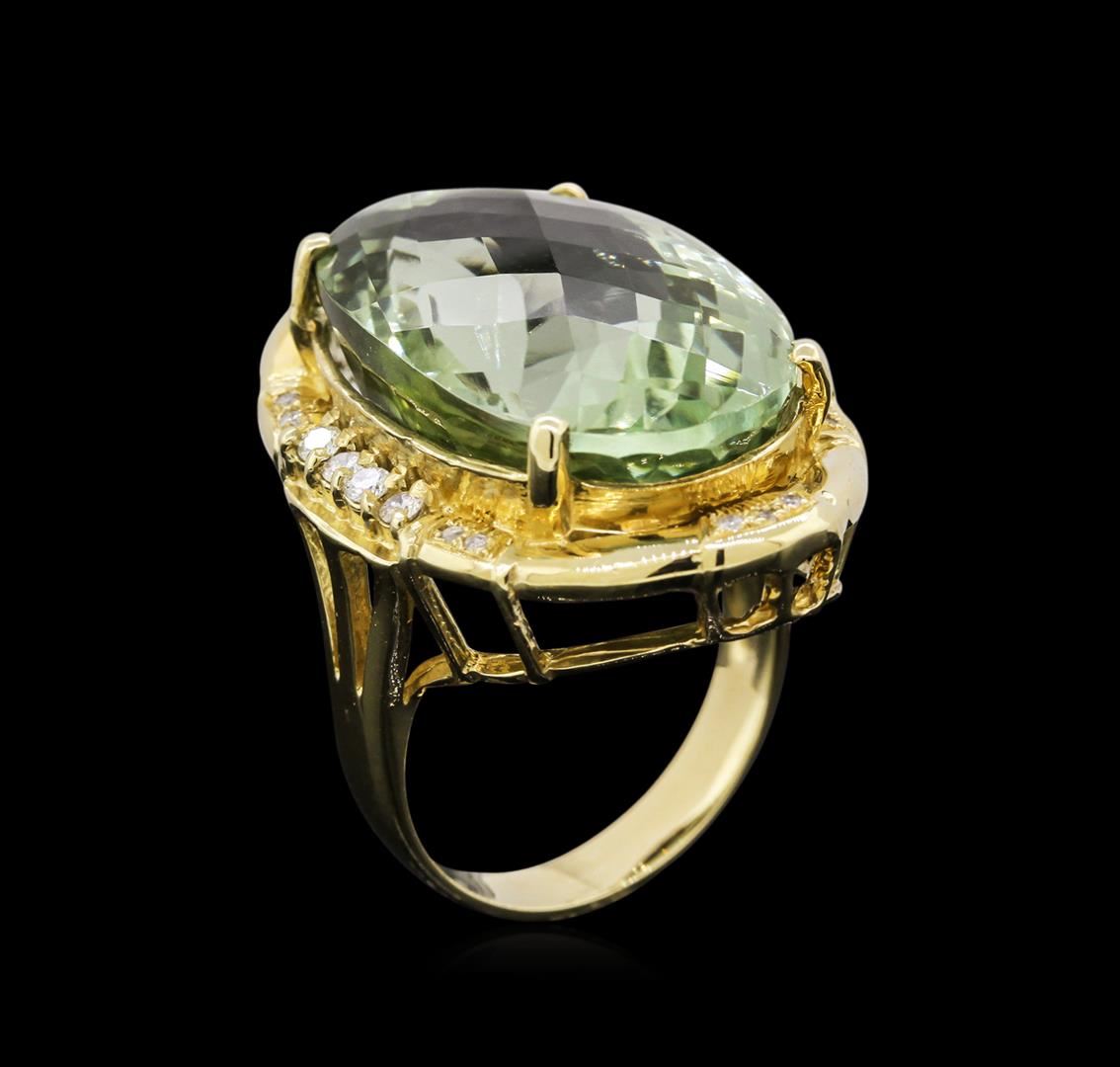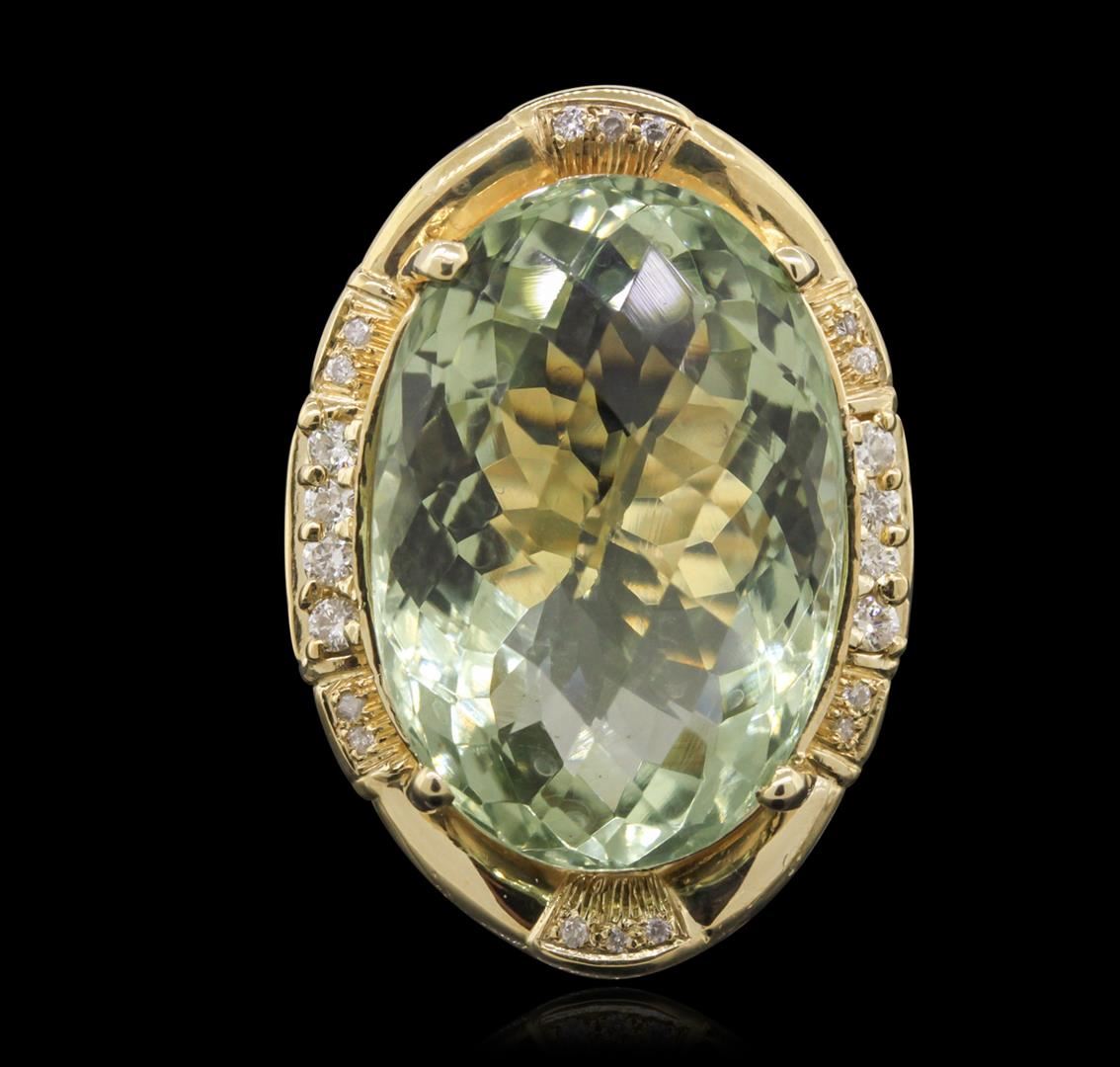 One electronically tested 14KT yellow gold ladies cast green quartz and diamond ring with a bright polish finish. Condition is new, good workmanship. The featured green quartz is set within a diamond bezel, supported by split shoulders and completed by a three and one-half millimeter wide band. Identified with markings of "K14". Containing: One prong set oval mixed cut natural green quartz, measuring 23.30 x 15.80 x 12.50mm, 8%. bulge factor, approximate weight of 27.45ct., clarity is eye clean, medium, very slightly grayish, very slightly bluish green color, (GIA vslbG 5/3), cut is good. Transmitting light with no distortion, transparent. Colored Stone Grading Report attached. Graded in the setting Eight prong set round brilliant cut diamonds, measuring 2.00 - 1.90 x 1.17mm (depth est.) approximate total weight of 8 Stones = 0.31ct. Graded in the setting. Clarity: I-1 to I-2 . Color: G - I Fourteen bead set round brilliant cut diamonds, measuring 1.10 - 1.00 x 0.63mm (depth est.) approximate total weight of 14 Stones = 0.60ct. Graded in the setting. Clarity: I-2 to I-3 . Color: G - I. Total Weight of Colored Stones 27.45ct. Total Weight of Diamonds 0.91ct. Total Weight of Ring 13.80 grams. AIG Appraised at $4,105.00.