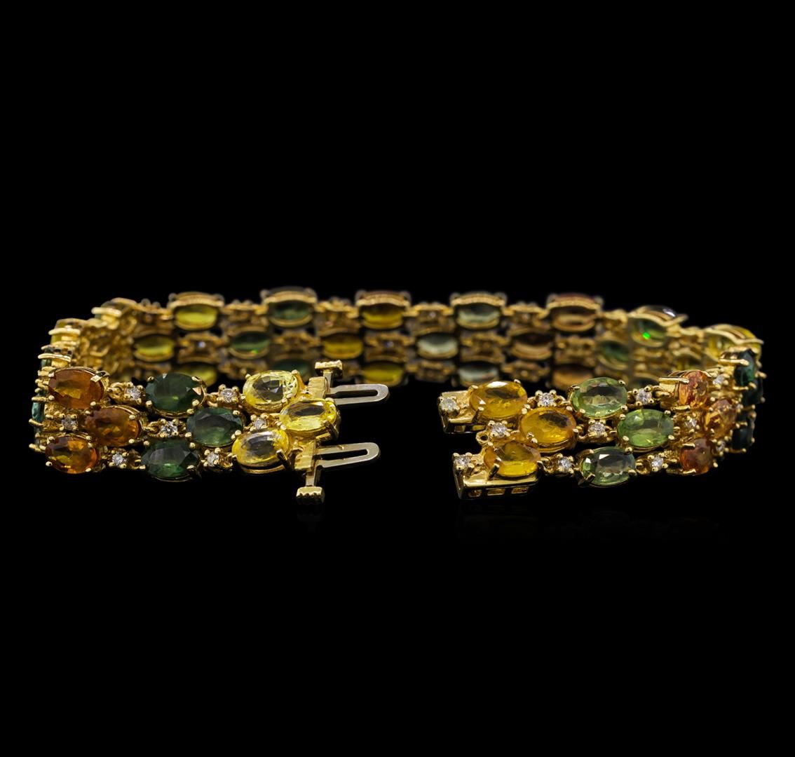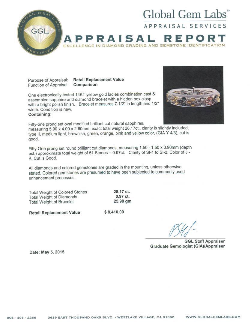 One electronically tested 14KT yellow gold ladies combination cast & assembled sapphire and diamond bracelet with a hidden box clasp with a bright polish finish. Bracelet measures 7-1/2" in length and 1/2" width. Condition is new. Containing: Fifty-one prong set oval modified brilliant cut natural sapphires, measuring 5.90 x 4.00 x 2.60mm, exact total weight 28.17ct., clarity is slightly included, type II, medium light, brownish, green, orange, pink and yellow color, (GIA Y 4/3), cut is good. Fifty-One prong set round brilliant cut diamonds, measuring 1.50 - 1.50 x 0.90mm (depth est.) approximate total weight of 51 Stones = 0.97ct. Clarity: SI-1 to SI-2. Color: J - K, Cut is Good. All diamonds and colored gemstones are graded in the mounting, unless otherwise stated. Colored gemstones are presumed to have been subjected to commonly used enhancement processes.. Total Weight of Colored Stones 28.17ct. Total Weight of Diamonds 0.97ct. Total Weight of Bracelet 25.90 grams. GGL Appraised at $8,410.00.