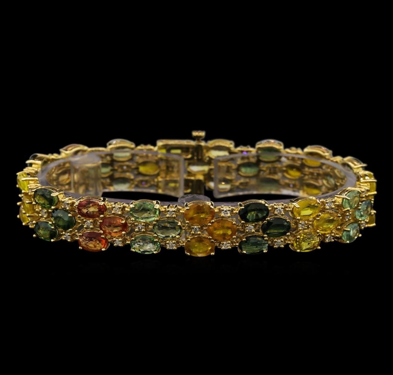 One electronically tested 14KT yellow gold ladies combination cast & assembled sapphire and diamond bracelet with a hidden box clasp with a bright polish finish. Bracelet measures 7-1/2" in length and 1/2" width. Condition is new. Containing: Fifty-one prong set oval modified brilliant cut natural sapphires, measuring 5.90 x 4.00 x 2.60mm, exact total weight 28.17ct., clarity is slightly included, type II, medium light, brownish, green, orange, pink and yellow color, (GIA Y 4/3), cut is good. Fifty-One prong set round brilliant cut diamonds, measuring 1.50 - 1.50 x 0.90mm (depth est.) approximate total weight of 51 Stones = 0.97ct. Clarity: SI-1 to SI-2. Color: J - K, Cut is Good. All diamonds and colored gemstones are graded in the mounting, unless otherwise stated. Colored gemstones are presumed to have been subjected to commonly used enhancement processes.. Total Weight of Colored Stones 28.17ct. Total Weight of Diamonds 0.97ct. Total Weight of Bracelet 25.90 grams. GGL Appraised at $8,410.00.