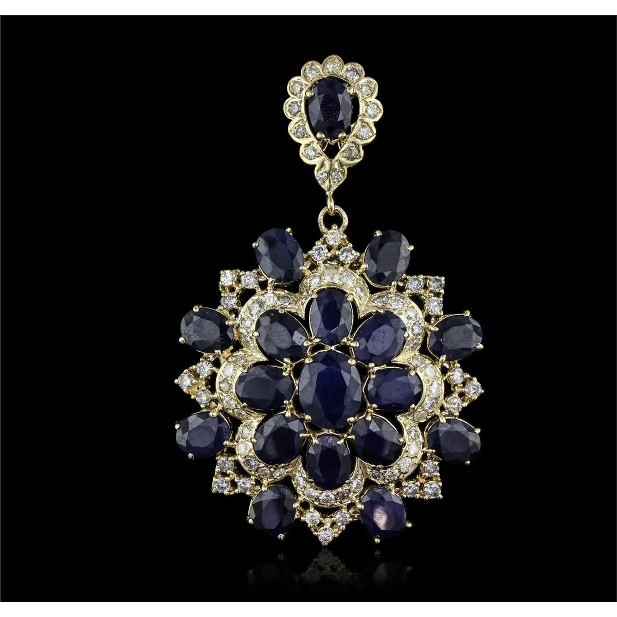 One electronically tested 14KT yellow gold Ladies combination cast & assembled pendant with a bright polish finish. Condition is new. Identified with markings of "K14". Containing: Seventeen prong set oval modified brilliant cut natural blue sapphires, measuring 7.80 x 5.90 x 3.84mm, approximate. Total Weight of 24.48ct., clarity is heavily included, type II, dark, moderately strong, blue color, (GIA B 7/4), cut is good. One prong set oval modified brilliant cut natural blue sapphire, measuring 10.50 x 8.50 x 5.53mm, approximate weight of 3.99ct., clarity is heavily included, type II, dark, moderately strong, blue color, (GIA B 7/4), cut is good. Colored gemstones are presumed to have been subjected to commonly used color/clarity enhancement processes. Seventy-Seven prong set round brilliant cut diamonds, measuring 2.20 - 2.00 x 1.26mm (depth est.) approximate. Total Weight of 77 Stones = 2.61ct. Clarity: I-2 to I-3. Color: I - J, Cut is Good. Total Weight of Colored Stones 28.47ct. Total Weight of Diamonds 2.61ct. Total Weight of Pendant 24.40 grams. GGL Appraised at $21,925.00.