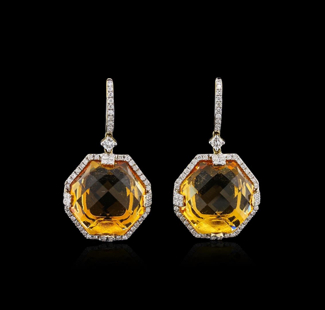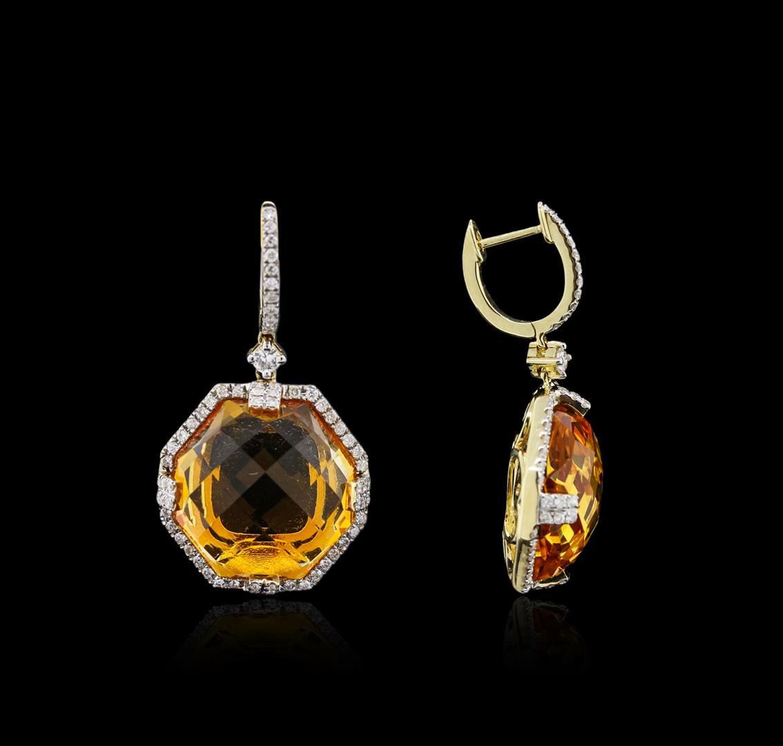 One pair of earrings featuring: 14KT yellow gold weighing 6.90 grams containing two citrines with a total weight of 28.54ct and 136 round diamonds with a total weight of 0.86ct.
