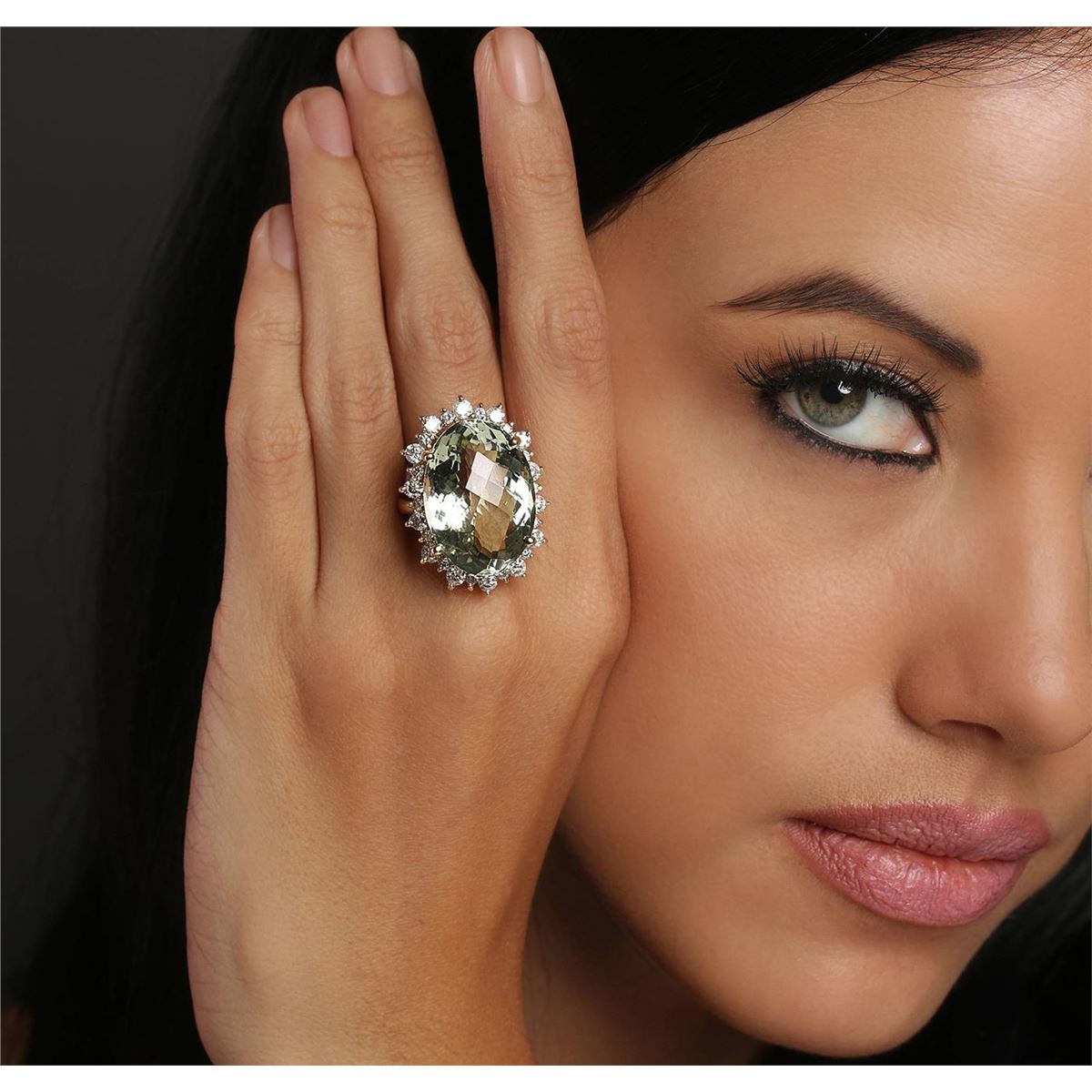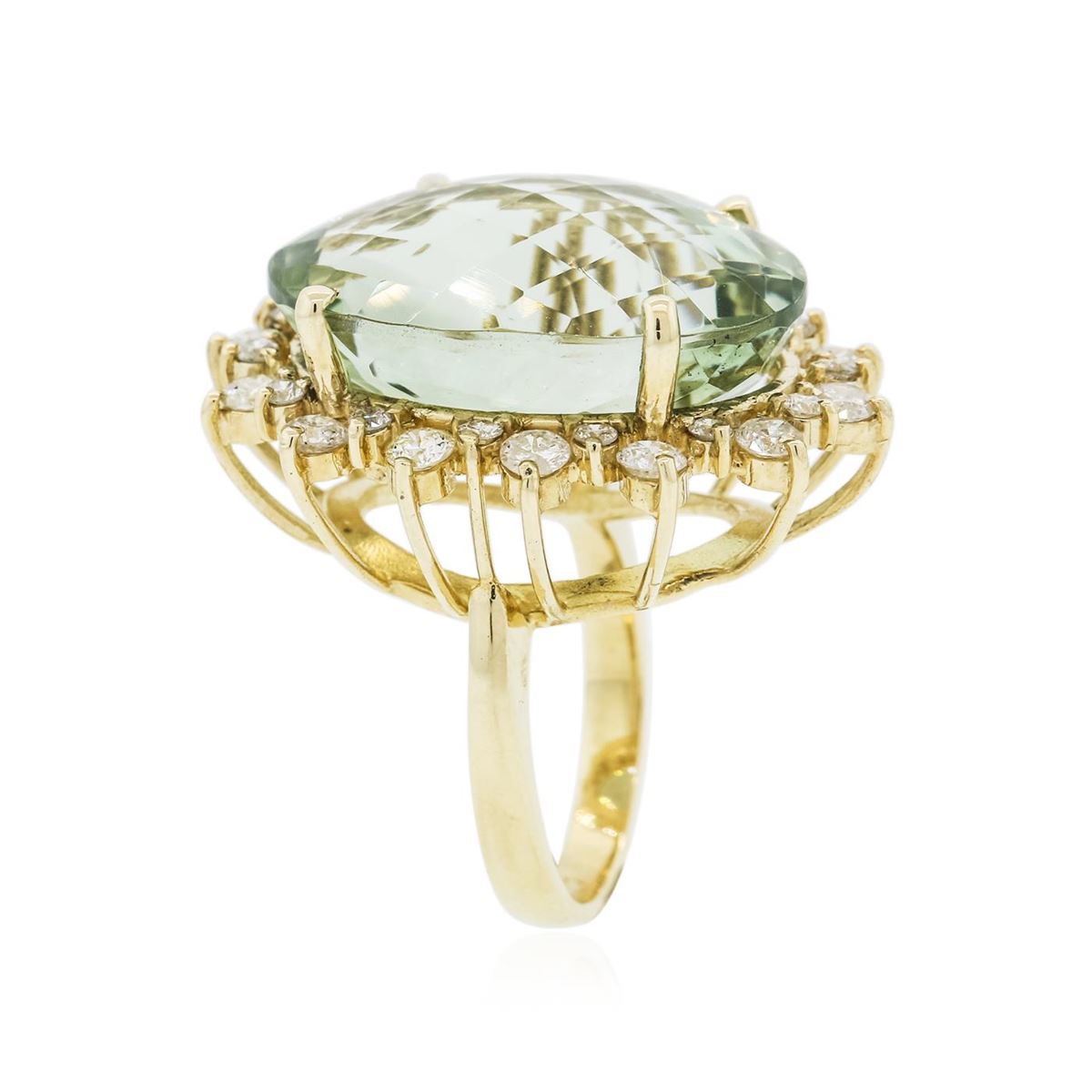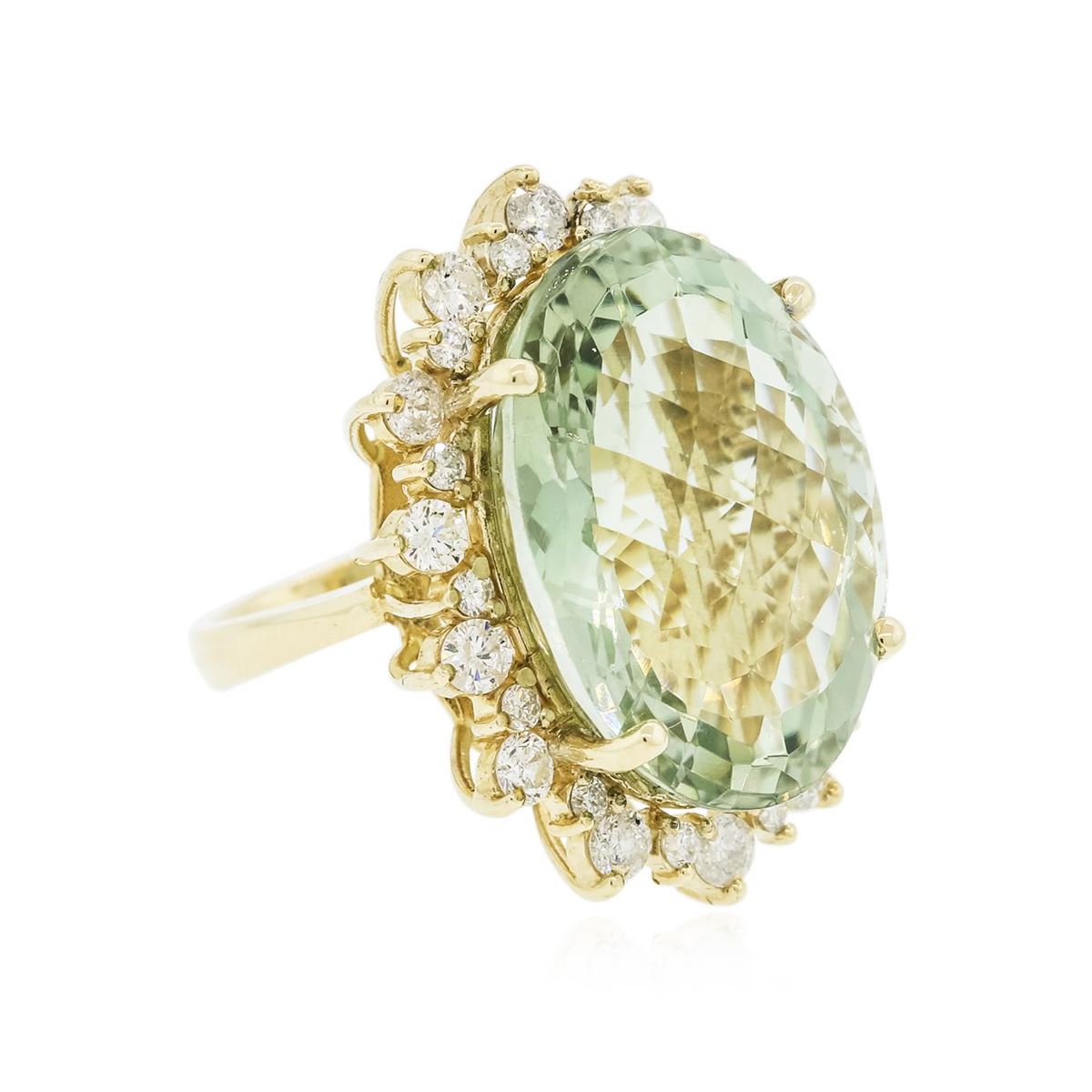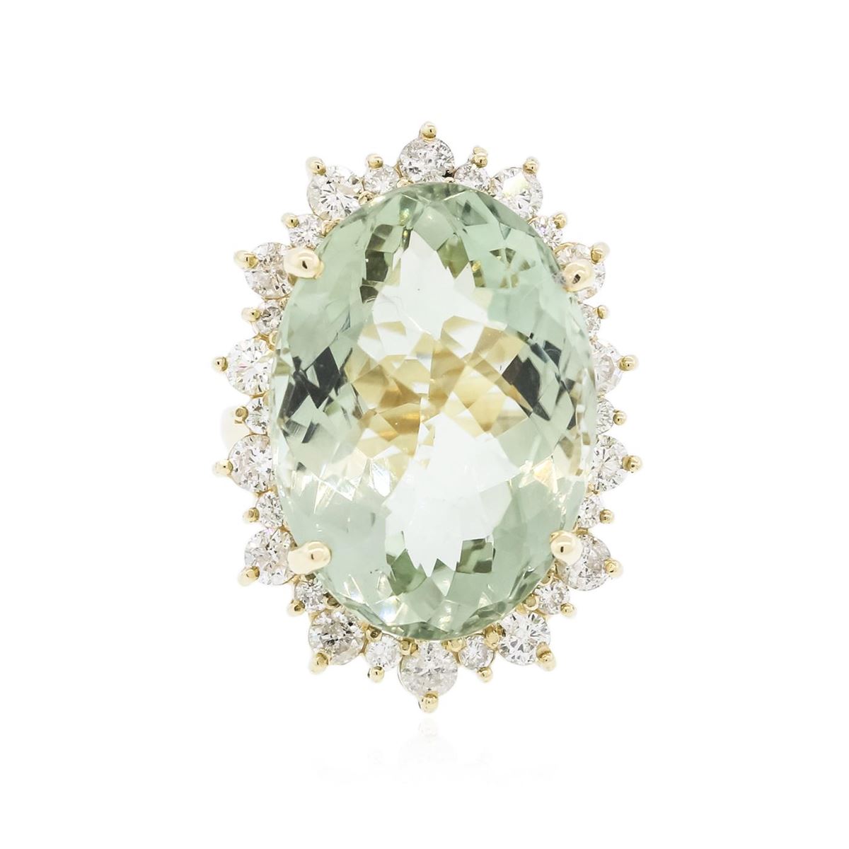 One electronically tested 14KT yellow gold ladies cast ring with a bright polish finish. Identified with markings of "K14". Condition is new. Containing: One prong set oval modified mixed cut natural greened amethyst, measuring 24.00 x 18.00 x 12.30mm, approximate weight of 28.86ct., clarity is eye clean, light, very slightly grayish, green color, (GIA G 3/3), cut is very good. Fourteen prong set round brilliant cut diamonds, measuring 3.00 - 3.00 x 1.80mm (depth est.) approximate total weight of 14 Stones = 1.38ct. Clarity: SI-2 to I-1. Color: J - K, Cut is Good. Fourteen prong set round brilliant cut diamonds, measuring 1.80 - 1.80 x 1.08mm (depth est.) approximate total weight of 14 Stones = 0.30ct. Clarity: SI-1 to I-1. Color: J - K, Cut is Good. Colored gemstones are presumed to have been subjected to commonly used enhancement processes. All diamonds and colored gemstones are graded in the mounting, unless otherwise stated. Total Weight of Colored Stones 28.86ct. Total Weight of Diamonds 1.68ct. Total Weight of Ring 15.30 grams. GGL Appraised at $9,100.00.