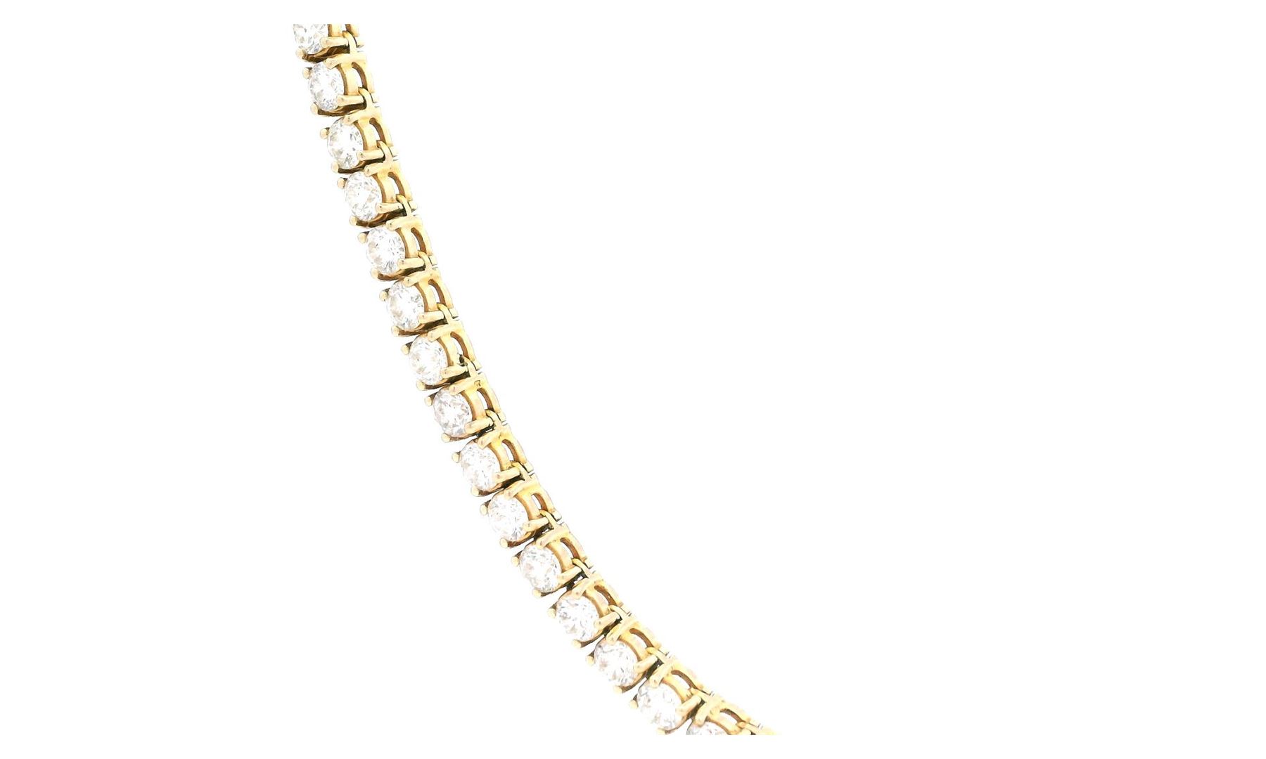 This exquisite 14KT yellow gold eternity necklace features a timeless design with a secure tongue clasp and fold-under safety. The piece showcases 158 round brilliant cut diamonds, totaling an impressive 29.50 carats, meticulously prong-set along the entire length of the 27-inch chain. Each diamond is graded H-I in color and VS-1 to SI-1 in clarity, exhibiting exceptional brilliance and fire. The basket motif setting enhances the structural integrity while maintaining a refined and elegant look.
