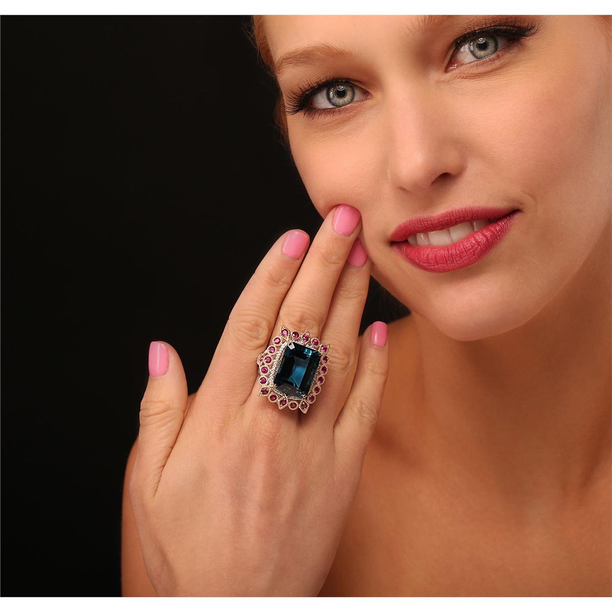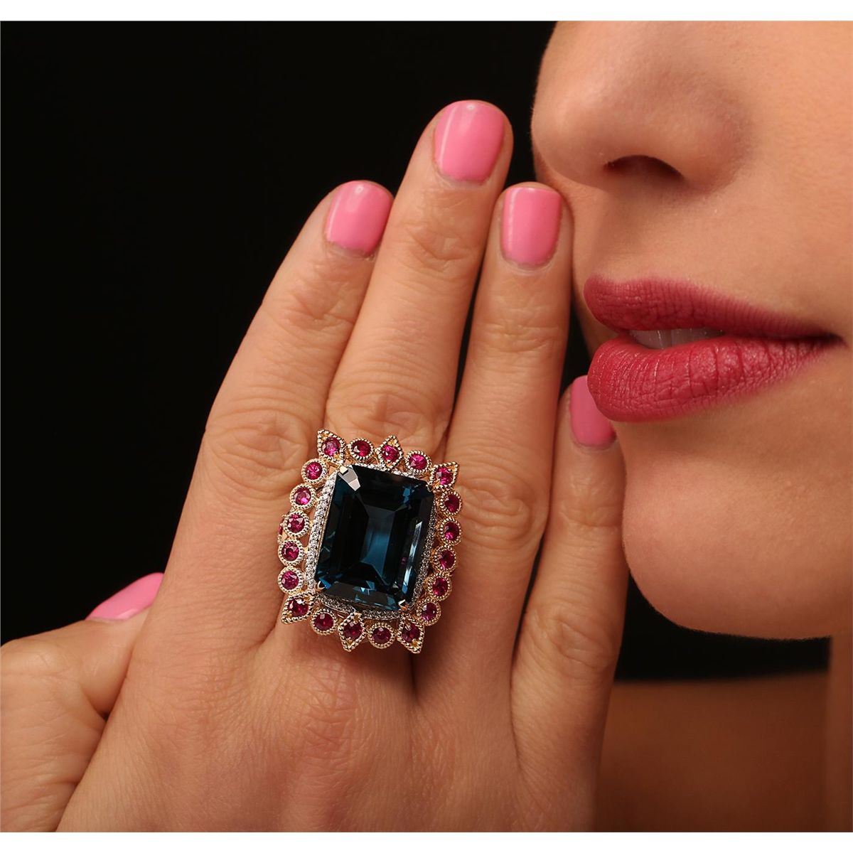 One electronically tested 14KT yellow gold Ladies combination cast & assembled ring with a bright polish finish. Condition is new. Identified with markings of "14K". Containing: One prong set emerald standard step cut natural blue topaz, measuring 20.00 x 14.91 x 10.51mm, approximate weight of 29.87ct., clarity is eye clean, type I, medium, moderately strong, blue color, (GIA B 5/4), cut is very good. Twenty-two bezel set round modified brilliant cut natural rubies, measuring 2.80 - 2.80 x 1.82 mm, approximate. Total Weight of 3.30ct., clarity is slightly included, medium, moderately strong, strongly purplish red color, (GIA stpR 5/4), cut is very good. Colored gemstones are presumed to have been subjected to commonly used color/clarity enhancement processes. Two prong set round brilliant cut diamonds, measuring 2.80 - 2.80 x 1.68mm (depth est.) approximate. Total Weight of 2 Stones = 0.16ct. Clarity: SI-1 to SI-2. Color: H - I, Cut is Very Good. One Hundred Sixteen prong set round brilliant cut diamonds, measuring 1.00 - 1.00 x 0.60mm (depth est.) approximate. Total Weight of 116 Stones = 0.50ct. Clarity: I-1 to I-2. Color: H - I, Cut is Good. Total Weight of Colored Stones 33.17ct. Total Weight of Diamonds 0.66ct. Total Weight of Ring 19.80 grams. GGL Appraised at $9,560.00.