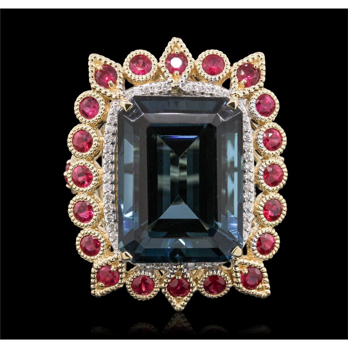 One electronically tested 14KT yellow gold Ladies combination cast & assembled ring with a bright polish finish. Condition is new. Identified with markings of "14K". Containing: One prong set emerald standard step cut natural blue topaz, measuring 20.00 x 14.91 x 10.51mm, approximate weight of 29.87ct., clarity is eye clean, type I, medium, moderately strong, blue color, (GIA B 5/4), cut is very good. Twenty-two bezel set round modified brilliant cut natural rubies, measuring 2.80 - 2.80 x 1.82 mm, approximate. Total Weight of 3.30ct., clarity is slightly included, medium, moderately strong, strongly purplish red color, (GIA stpR 5/4), cut is very good. Colored gemstones are presumed to have been subjected to commonly used color/clarity enhancement processes. Two prong set round brilliant cut diamonds, measuring 2.80 - 2.80 x 1.68mm (depth est.) approximate. Total Weight of 2 Stones = 0.16ct. Clarity: SI-1 to SI-2. Color: H - I, Cut is Very Good. One Hundred Sixteen prong set round brilliant cut diamonds, measuring 1.00 - 1.00 x 0.60mm (depth est.) approximate. Total Weight of 116 Stones = 0.50ct. Clarity: I-1 to I-2. Color: H - I, Cut is Good. Total Weight of Colored Stones 33.17ct. Total Weight of Diamonds 0.66ct. Total Weight of Ring 19.80 grams. GGL Appraised at $9,560.00.