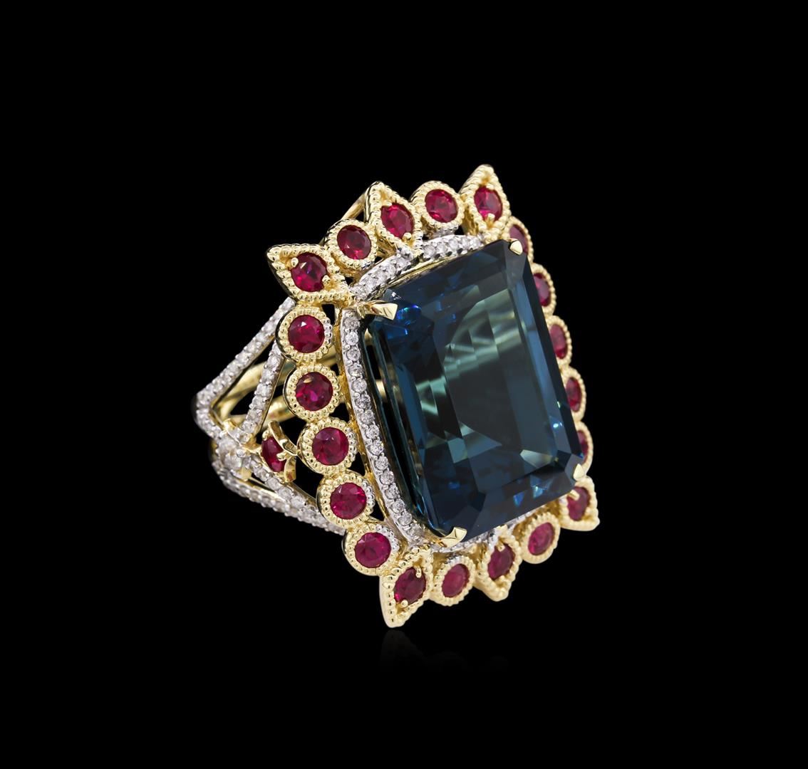 One electronically tested 14KT yellow gold Ladies combination cast & assembled ring with a bright polish finish. Condition is new. Identified with markings of "14K". Containing: One prong set emerald standard step cut natural blue topaz, measuring 20.00 x 14.91 x 10.51mm, approximate weight of 29.87ct., clarity is eye clean, type I, medium, moderately strong, blue color, (GIA B 5/4), cut is very good. Twenty-two bezel set round modified brilliant cut natural rubies, measuring 2.80 - 2.80 x 1.82 mm, approximate. Total Weight of 3.30ct., clarity is slightly included, medium, moderately strong, strongly purplish red color, (GIA stpR 5/4), cut is very good. Colored gemstones are presumed to have been subjected to commonly used color/clarity enhancement processes. Two prong set round brilliant cut diamonds, measuring 2.80 - 2.80 x 1.68mm (depth est.) approximate. Total Weight of 2 Stones = 0.16ct. Clarity: SI-1 to SI-2. Color: H - I, Cut is Very Good. One Hundred Sixteen prong set round brilliant cut diamonds, measuring 1.00 - 1.00 x 0.60mm (depth est.) approximate. Total Weight of 116 Stones = 0.50ct. Clarity: I-1 to I-2. Color: H - I, Cut is Good. Total Weight of Colored Stones 33.17ct. Total Weight of Diamonds 0.66ct. Total Weight of Ring 19.80 grams. GGL Appraised at $9,560.00.