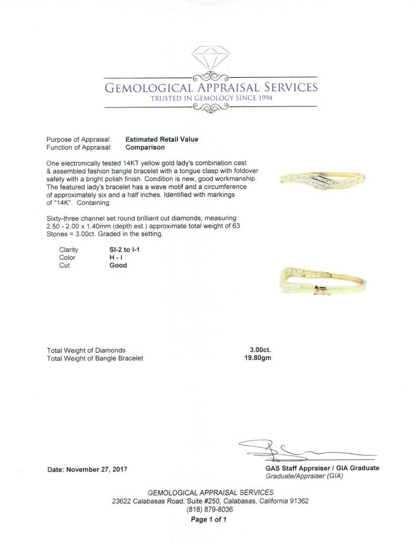 One electronically tested 14KT yellow gold lady's combination cast & assembled fashion bangle bracelet with a tongue clasp with foldover safety with a bright polish finish. The featured lady's bracelet has a wave motif and a circumference of approximately six and a half inches. Identified with markings of '14K'. Condition is new, good workmanship. Containing: One diamond(depth est.) approximate weight of 0.00ct. Sixty-Three channel set round brilliant cut diamonds, measuring 2.50 - 2.00 x 1.40mm (depth est.) approximate total weight of 63 Stones = 3.00ct. Graded in the setting. Color H - I Clarity SI-2 to I-1 Cut Good. Total Weight of Diamonds 3.00ct.. Total Weight of Bangle Bracelet 19.80gm. GAS Appraised.