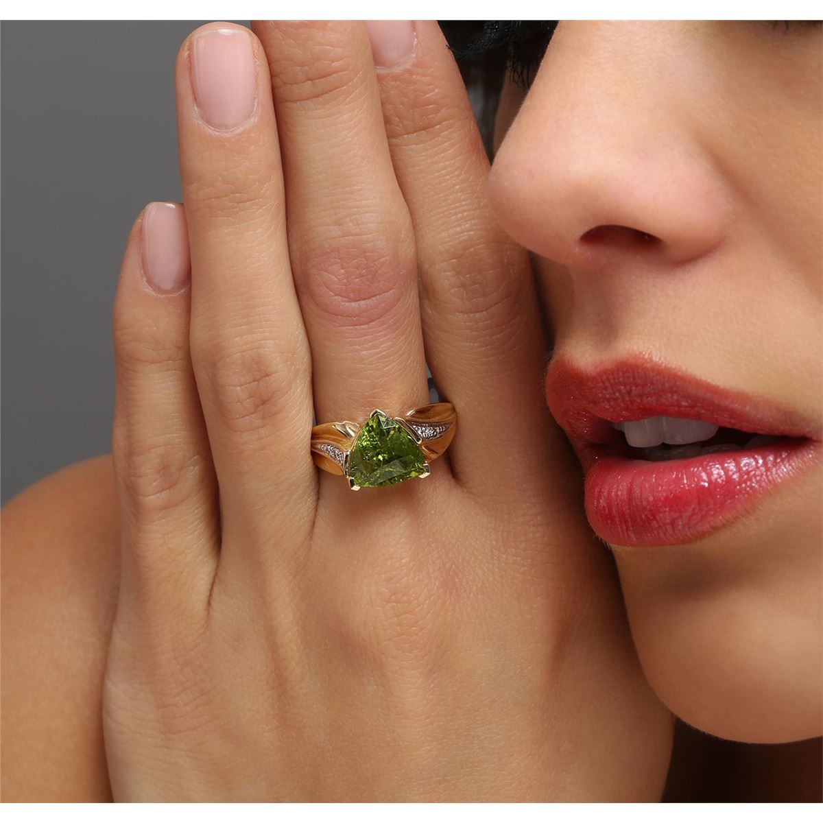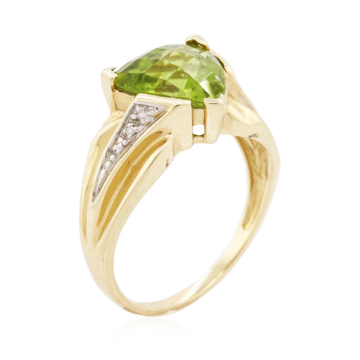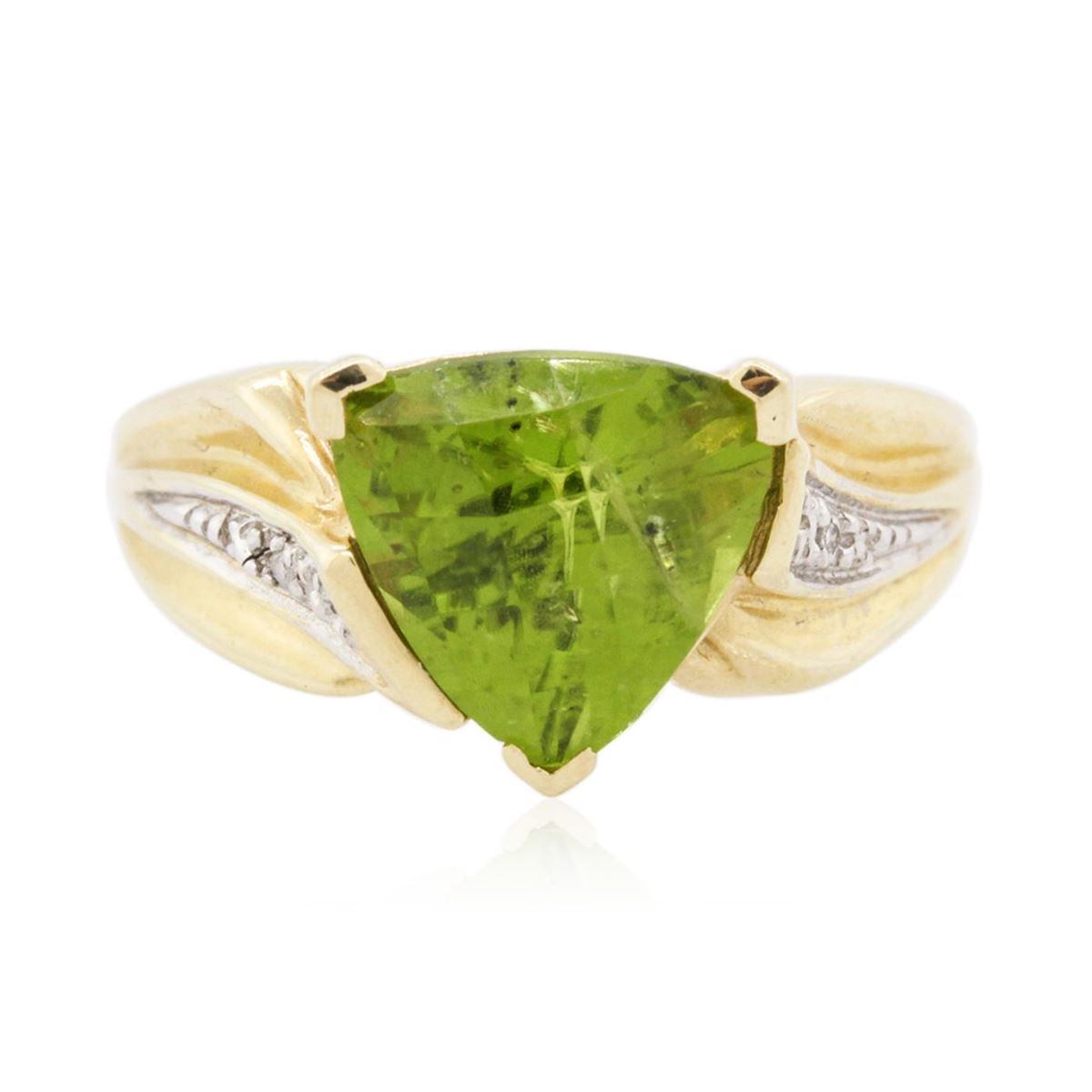 One ring featuring: 14KT yellow gold weighing 4.10 grams containing one peridot center stone with a total weight of 3.00ct and round diamonds with a total weight of 0.02cts.