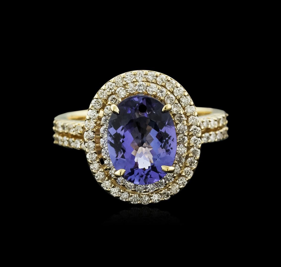 One electronically tested 14KT yellow gold ladies cast tanzanite and diamond ring with a bright polish finish. Identified with markings of "14K". Condition is new. Containing: One prong set oval modified brilliant cut natural tanzanite, measuring 10.30 x 8.00 x 5.21mm, approximate weight of 3.02ct., clarity is eye clean, type I, medium light, very slightly grayish, violet color, (GIA V 4/3), cut is very good. Eighty-Four prong set round brilliant cut diamonds, measuring 1.20 - 1.20 x 0.72mm (depth est.) approximate total weight of 84 Stones = 0.53ct. Clarity: I-1 to I-2. Color: I - J, Cut is Good. Colored gemstones are presumed to have been subjected to commonly used enhancement processes. All diamonds and colored gemstones are graded in the mounting, unless otherwise stated. Total Weight of Colored Stones 3.02ct. Total Weight of Diamonds 0.53ct. Total Weight of Ring 5.80 grams. GGL Appraised at $3,610.00.