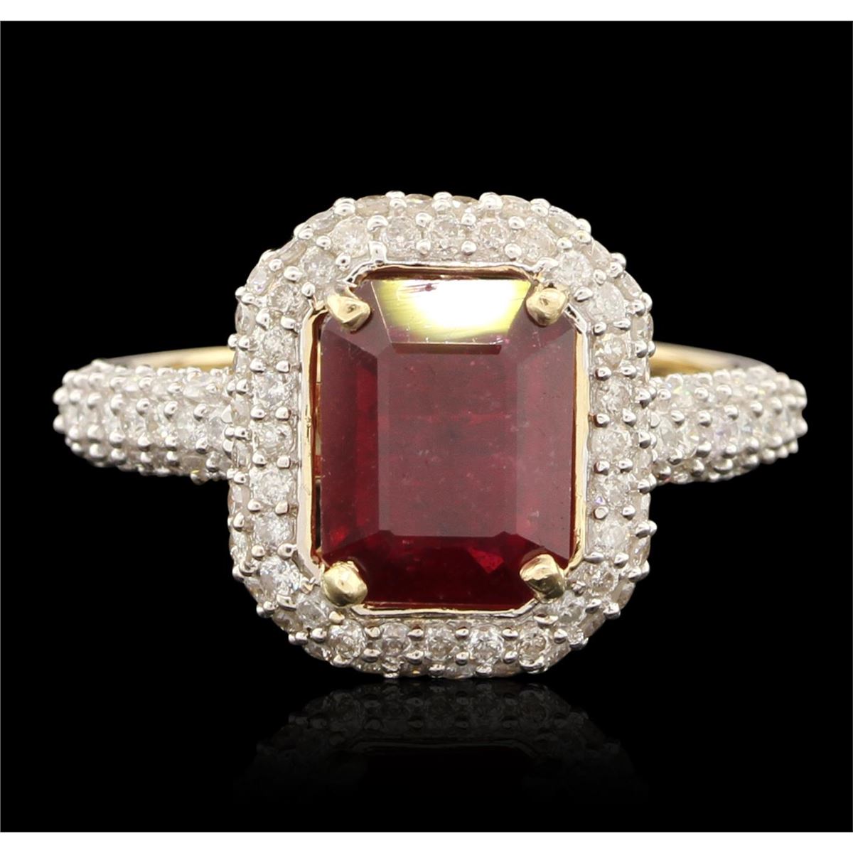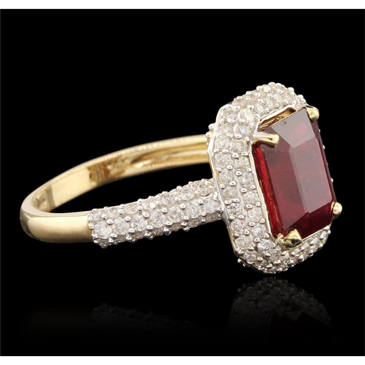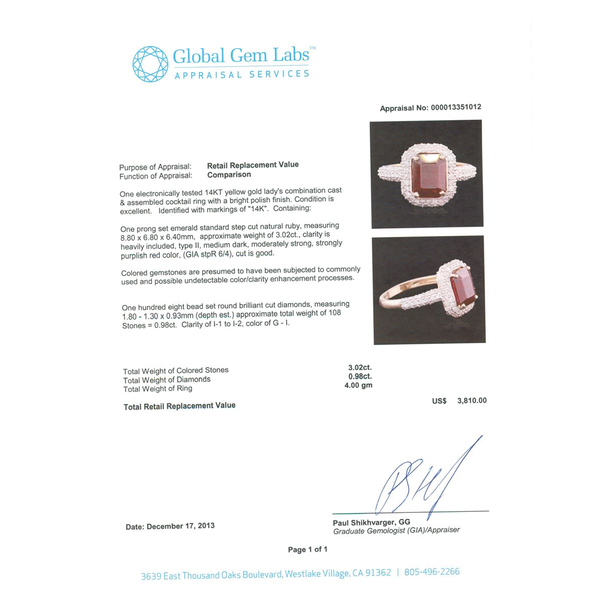 One electronically tested 14KT yellow gold Ladies combination cast & assembled cocktail ring with a bright polish finish. Identified with markings of "14K". Condition is excellent. Containing: One prong set emerald standard step cut natural ruby, measuring 8.80 x 6.80 x 6.40mm, approximate weight of 3.02ct., clarity is heavily included, type II, medium dark, moderately strong, strongly purplish red color, (GIA stpR 6/4), cut is good. Colored gemstones are presumed to have been subjected to commonly used and possible undetectable color/clarity enhancement processes. One Hundred Eight bead set round brilliant cut diamonds, measuring 1.80 - 1.30 x 0.93mm (depth est.) approximate total weight of 108 Stones = 0.98ct. Clarity of I-1 to I-2, Color of G - I. Total Weight of Colored Stones 3.02ct. Total Weight of Diamonds 0.98ct. Total Weight of Ring 4.00gm. GGL Appraised at $3,810.00.