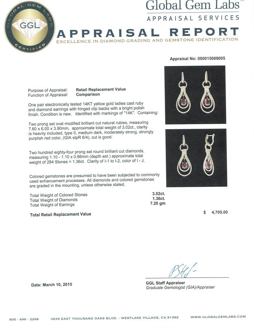 One pair electronically tested 14KT yellow gold ladies cast ruby and diamond earrings with hinged clip backs with a bright polish finish. Identified with markings of "14K". Condition is new. Containing: Two prong set oval modified brilliant cut natural rubies, measuring 7.60 x 6.00 x 3.90mm, approximate total weight of 3.02ct., clarity is heavily included, type II, medium dark, moderately strong, strongly purplish red color, (GIA stpR 6/4), cut is good. Two Hundred Eighty-Four prong set round brilliant cut diamonds, measuring 1.10 - 1.10 x 0.66mm (depth est.) approximate total weight of 284 Stones = 1.36ct. Clarity: I-1 to I-2. Color: I - J. Colored gemstones are presumed to have been subjected to commonly used enhancement processes. All diamonds and colored gemstones are graded in the mounting, unless otherwise stated. Total Weight of Colored Stones 3.02ct. Total Weight of Diamonds 1.36ct. Total Weight of Earrings 7.20 grams. GGL Appraised at $4,705.00.