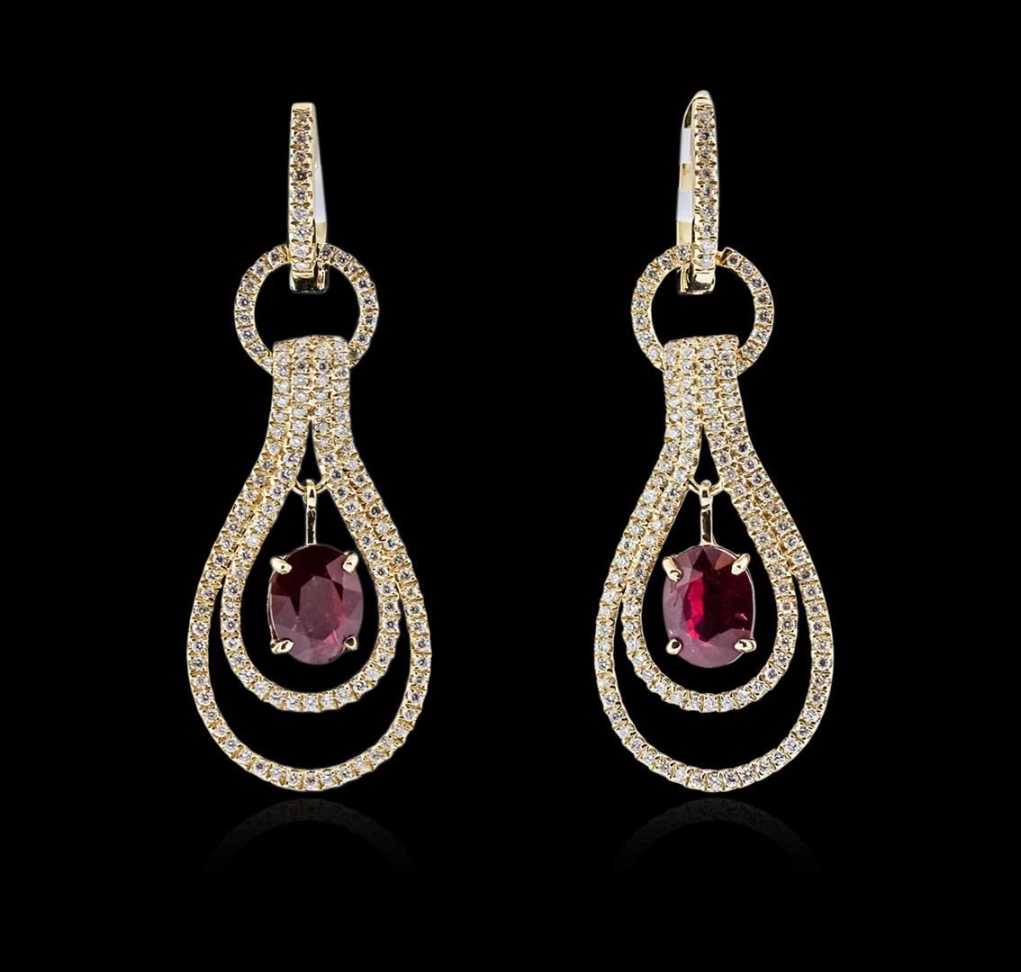 One pair electronically tested 14KT yellow gold ladies cast ruby and diamond earrings with hinged clip backs with a bright polish finish. Identified with markings of "14K". Condition is new. Containing: Two prong set oval modified brilliant cut natural rubies, measuring 7.60 x 6.00 x 3.90mm, approximate total weight of 3.02ct., clarity is heavily included, type II, medium dark, moderately strong, strongly purplish red color, (GIA stpR 6/4), cut is good. Two Hundred Eighty-Four prong set round brilliant cut diamonds, measuring 1.10 - 1.10 x 0.66mm (depth est.) approximate total weight of 284 Stones = 1.36ct. Clarity: I-1 to I-2. Color: I - J. Colored gemstones are presumed to have been subjected to commonly used enhancement processes. All diamonds and colored gemstones are graded in the mounting, unless otherwise stated. Total Weight of Colored Stones 3.02ct. Total Weight of Diamonds 1.36ct. Total Weight of Earrings 7.20 grams. GGL Appraised at $4,705.00.