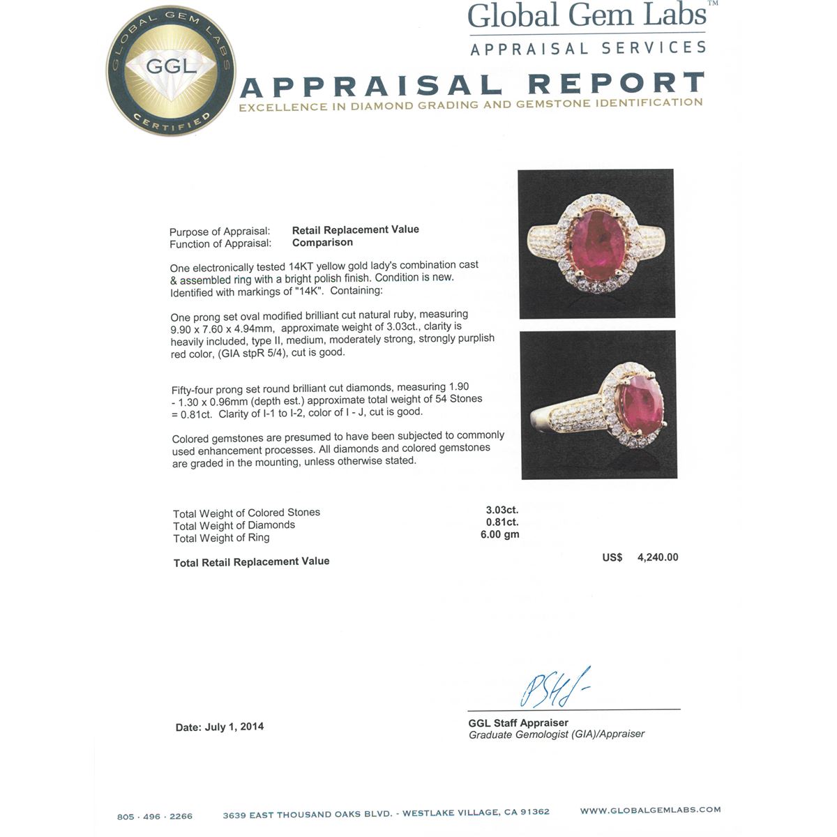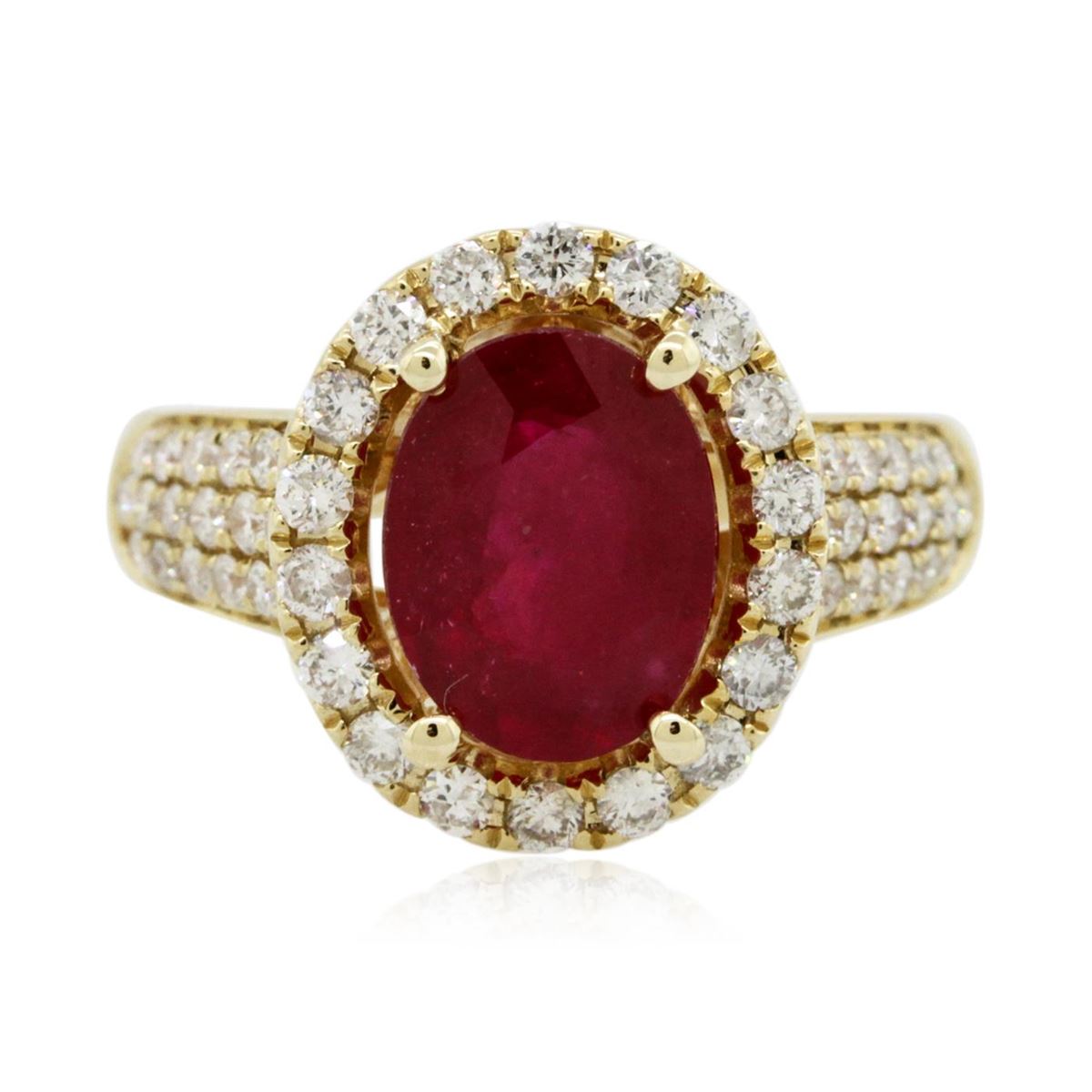 One electronically tested 14KT yellow gold Ladies combination cast & assembled ring with a bright polish finish. Condition is new. Identified with markings of "14K". Containing: One prong set oval modified brilliant cut natural ruby, measuring 9.90 x 7.60 x 4.94mm, approximate weight of 3.03ct., clarity is heavily included, type II, medium, moderately strong, strongly purplish red color, (GIA stpR 5/4), cut is good. Fifty-Four prong set round brilliant cut diamonds, measuring 1.90 - 1.30 x 0.96mm (depth est.) approximate total weight of 54 Stones = 0.81ct. Clarity: I-1 to I-2. Color: I - J, Cut is Good. Colored gemstones are presumed to have been subjected to commonly used enhancement processes. All diamonds and colored gemstones are graded in the mounting, unless otherwise stated. Total Weight of Colored Stones 3.03ct. Total Weight of Diamonds 0.81ct. Total Weight of Ring 6.00 grams. GGL Appraised at $4,240.00.