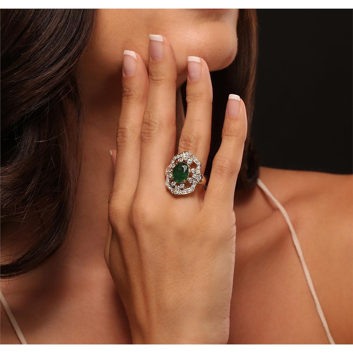 One electronically tested 14KT yellow gold Ladies combination cast & assembled fancy ring with a high polish finish. Condition is new. Identified with markings of "14K". Containing: One prong set oval modified brilliant cut natural emerald, measuring 11.50 x 9.00 x 5.30mm, approximate weight of 3.03ct., clarity is heavily included, type III, medium dark, moderately strong, green color, (GIA G 6/4), cut is good. Colored gemstones are presumed to have been subjected to commonly used and possible undetectable color/clarity enhancement processes. Ten bezel set round brilliant cut diamonds, measuring 2.50 - 2.50 x 1.66mm (depth est.) approximate total weight of 10 Stones = 0.63ct. Clarity of SI-2 to I-1, Color of J - K, Cut is Good. Twenty-Seven bead set round brilliant cut diamonds, measuring 2.10 - 1.80 x 1.17mm (depth est.) approximate total weight of 27 Stones = 0.73ct. Clarity of SI-2 to I-1, Color of J - L, Cut is Good. Total Weight of Colored Stones 3.03ct. Total Weight of Diamonds 1.36ct. Total Weight of Ring 7.90 grams. GGL Appraised at $11,215.00.