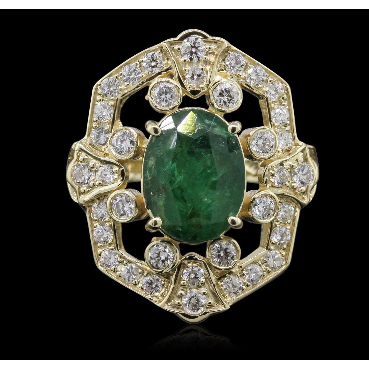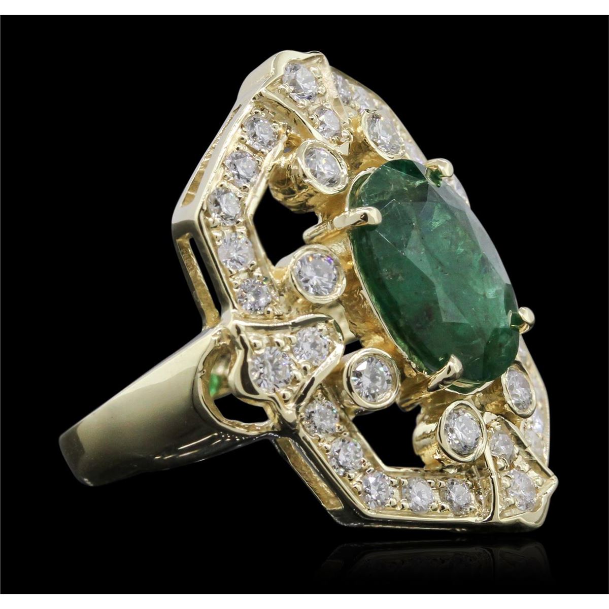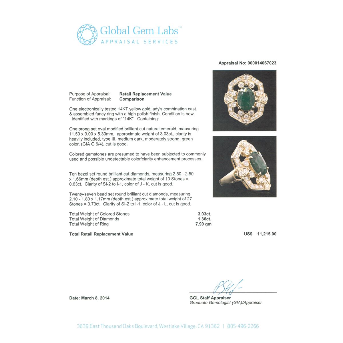 One electronically tested 14KT yellow gold Ladies combination cast & assembled fancy ring with a high polish finish. Condition is new. Identified with markings of "14K". Containing: One prong set oval modified brilliant cut natural emerald, measuring 11.50 x 9.00 x 5.30mm, approximate weight of 3.03ct., clarity is heavily included, type III, medium dark, moderately strong, green color, (GIA G 6/4), cut is good. Colored gemstones are presumed to have been subjected to commonly used and possible undetectable color/clarity enhancement processes. Ten bezel set round brilliant cut diamonds, measuring 2.50 - 2.50 x 1.66mm (depth est.) approximate total weight of 10 Stones = 0.63ct. Clarity of SI-2 to I-1, Color of J - K, Cut is Good. Twenty-Seven bead set round brilliant cut diamonds, measuring 2.10 - 1.80 x 1.17mm (depth est.) approximate total weight of 27 Stones = 0.73ct. Clarity of SI-2 to I-1, Color of J - L, Cut is Good. Total Weight of Colored Stones 3.03ct. Total Weight of Diamonds 1.36ct. Total Weight of Ring 7.90 grams. GGL Appraised at $11,215.00.
