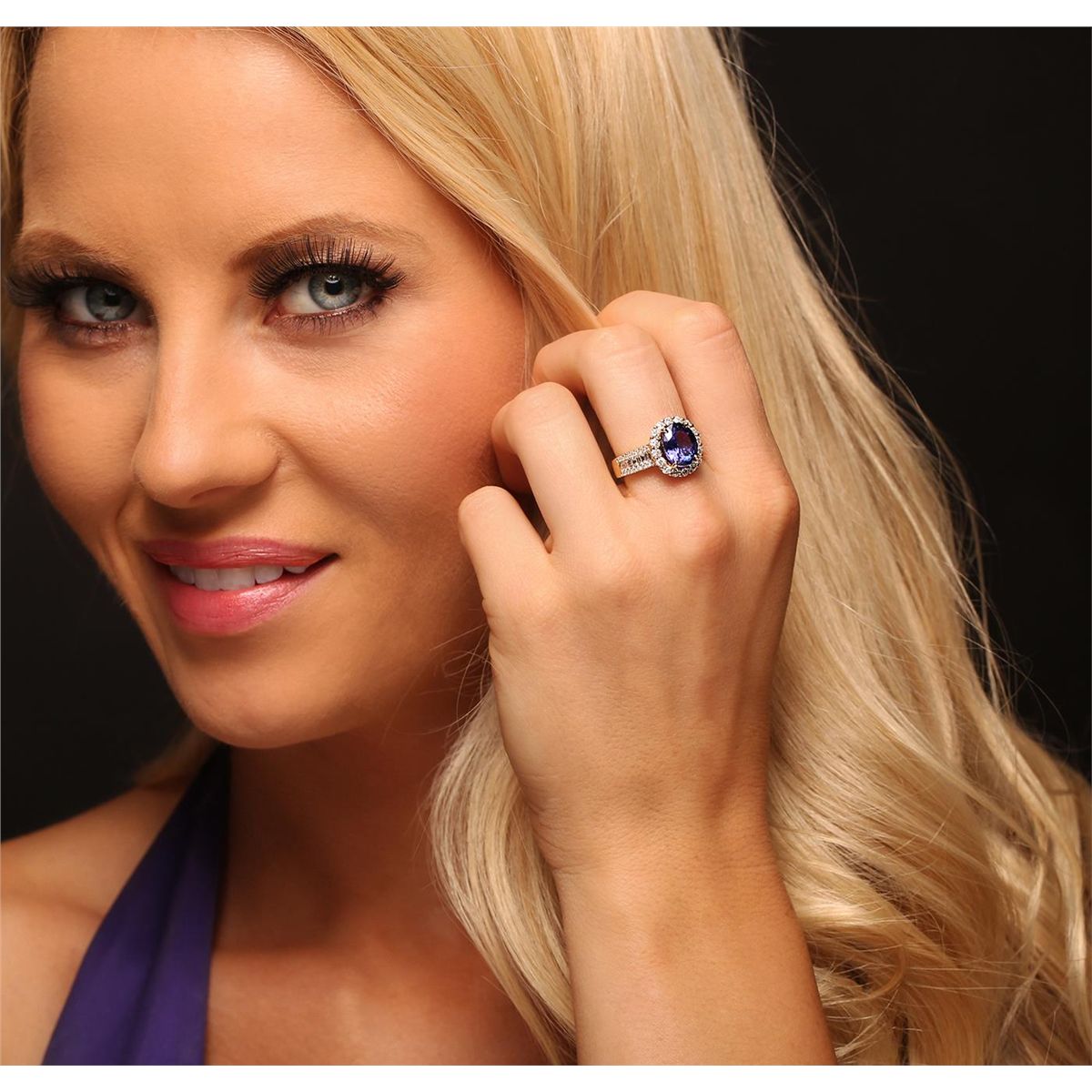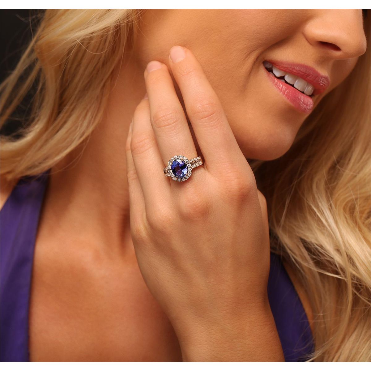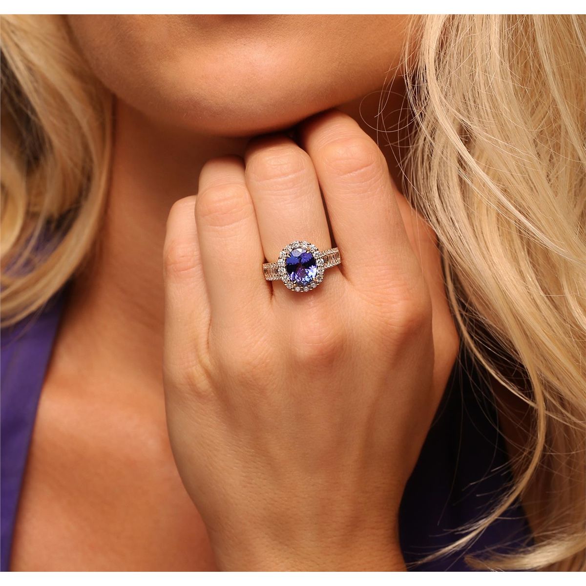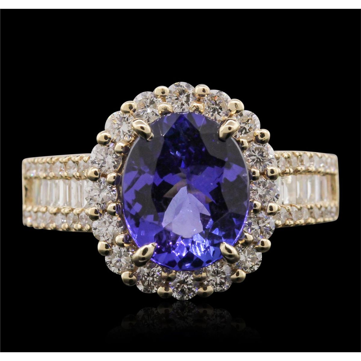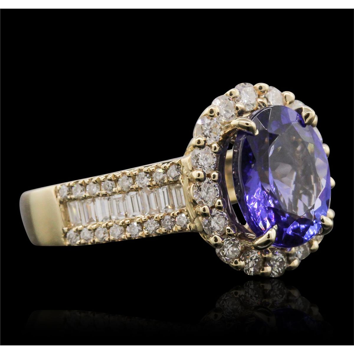 One electronically tested 14KT yellow gold Ladies combination cast & assembled ring with a high polish finish. Condition is new. Identified with markings of "14K". Containing: One prong set oval modified mixed cut natural tanzanite, measuring 10.00 x 8.00 x 4.44mm, approximate weight of 3.04ct., clarity is eye clean, type I, medium, moderately strong, bluish violet color, (GIA bV 5/4), cut is good. Colored gemstones are presumed to have been subjected to commonly used color/clarity enhancement processes. Fifty-Six bead set round brilliant cut diamonds, measuring 1.40 - 1.00 x 0.72mm (depth est.) approximate. Total Weight of 56 Stones = 0.42ct. Clarity: I-1 to I-2. Color: H - I, Cut is Good. Sixteen invisible set princess cut diamonds, measuring 2.00 x 2.00 x 1.50mm (depth est.) approximate. Total Weight of 16 Stones = 0.79ct. Clarity: SI-1 to SI-2. Color: G - H, Cut is Good. Total Weight of Colored Stones 3.04ct. Total Weight of Diamonds 1.21ct. Total Weight of Ring 5.90 grams. GGL Appraised at $7,535.00.
