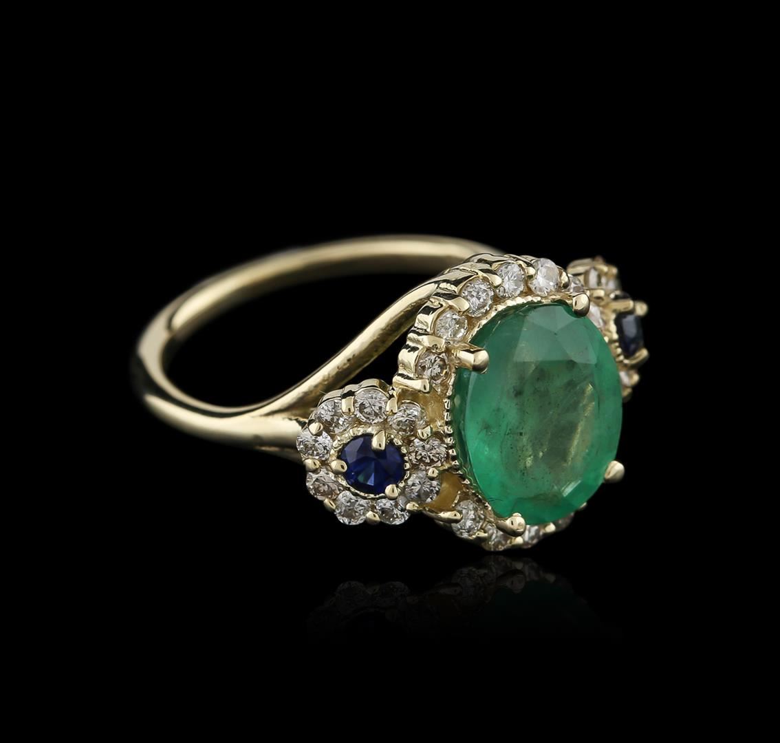 One electronically tested 14KT yellow gold ladies cast emerald, sapphire and diamond ring with a half round shank with a bright polish finish. Identified with markings of "14K". Condition is new. Containing: One prong set oval modified brilliant cut natural emerald, measuring 10.87 x 9.00 x 5.47mm, approximate weight of 3.06ct., clarity is heavily included, type III, medium light, slightly grayish, green color, (GIA G 4/2), cut is good. Two prong set round modified brilliant cut natural blue sapphires, measuring 3.00 - 3.00 x 1.95 mm, approximate total weight of 0.28ct., clarity is eye clean, type II, medium, moderately strong, blue color, (GIA B 5/4), cut is good. Thirty prong set round brilliant cut diamonds, measuring 1.80 - 1.80 x 1.08mm (depth est.) approximate total weight of 30 Stones = 0.64ct. Clarity: SI-2 to I-1. Color: J - K, Cut is Good. All diamonds and colored gemstones are graded in the mounting, unless otherwise stated. Colored gemstones are presumed to have been subjected to commonly used enhancement processes.. Total Weight of Colored Stones 3.34ct. Total Weight of Diamonds 0.64ct. Total Weight of Ring 6.10 grams. GGL Appraised at $3,205.00.