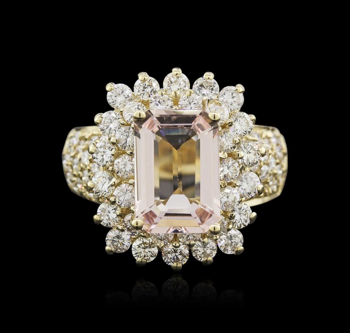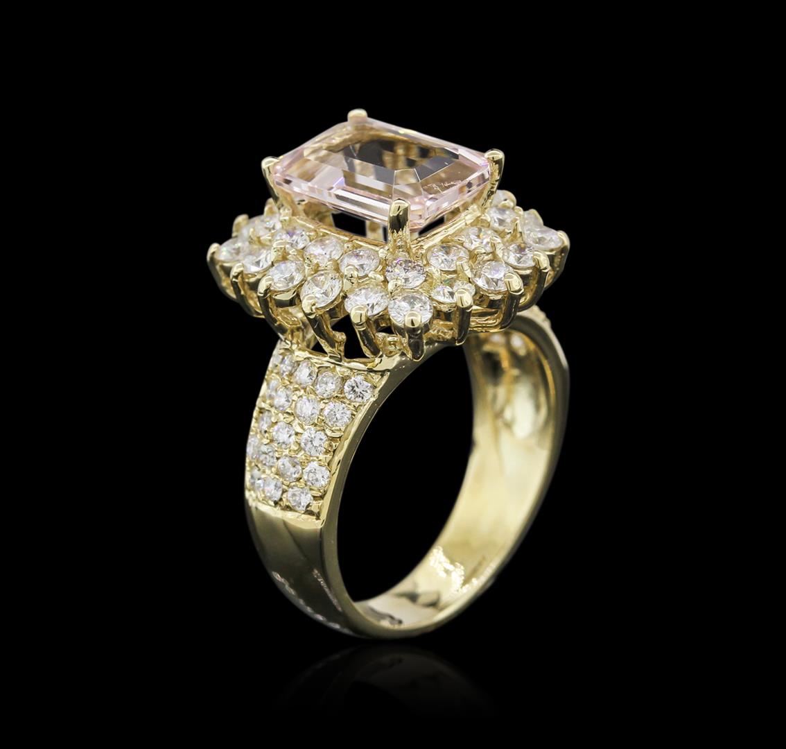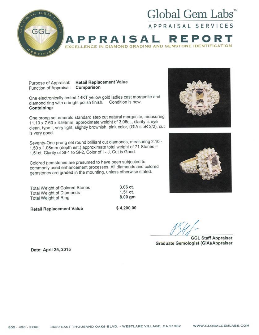 One electronically tested 14KT yellow gold ladies cast morganite and diamond ring with a bright polish finish. Condition is new. Containing: One prong set emerald standard step cut natural morganite, measuring 11.10 x 7.60 x 4.94mm, approximate weight of 3.06ct., clarity is eye clean, type I, very light, slightly brownish, pink color, (GIA slpR 2/2), cut is very good. Seventy-One prong set round brilliant cut diamonds, measuring 2.10 - 1.50 x 1.08mm (depth est.) approximate total weight of 71 Stones = 1.51ct. Clarity: SI-1 to SI-2. Color: I - J, Cut is Good. Colored gemstones are presumed to have been subjected to commonly used enhancement processes. All diamonds and colored gemstones are graded in the mounting, unless otherwise stated. Total Weight of Colored Stones 3.06ct. Total Weight of Diamonds 1.51ct. Total Weight of Ring 8.00 grams. GGL Appraised at $4,200.00.