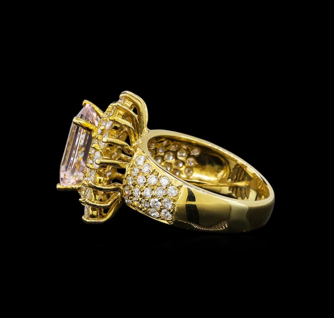 One electronically tested 14KT yellow gold ladies cast morganite and diamond ring with a bright polish finish. Condition is new. Containing: One prong set emerald standard step cut natural morganite, measuring 11.10 x 7.60 x 4.94mm, approximate weight of 3.06ct., clarity is eye clean, type I, very light, slightly brownish, pink color, (GIA slpR 2/2), cut is very good. Seventy-One prong set round brilliant cut diamonds, measuring 2.10 - 1.50 x 1.08mm (depth est.) approximate total weight of 71 Stones = 1.51ct. Clarity: SI-1 to SI-2. Color: I - J, Cut is Good. Colored gemstones are presumed to have been subjected to commonly used enhancement processes. All diamonds and colored gemstones are graded in the mounting, unless otherwise stated. Total Weight of Colored Stones 3.06ct. Total Weight of Diamonds 1.51ct. Total Weight of Ring 8.00 grams. GGL Appraised at $4,200.00.