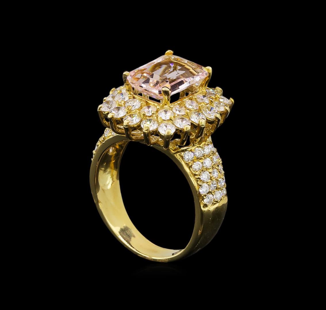 One electronically tested 14KT yellow gold ladies cast morganite and diamond ring with a bright polish finish. Condition is new. Containing: One prong set emerald standard step cut natural morganite, measuring 11.10 x 7.60 x 4.94mm, approximate weight of 3.06ct., clarity is eye clean, type I, very light, slightly brownish, pink color, (GIA slpR 2/2), cut is very good. Seventy-One prong set round brilliant cut diamonds, measuring 2.10 - 1.50 x 1.08mm (depth est.) approximate total weight of 71 Stones = 1.51ct. Clarity: SI-1 to SI-2. Color: I - J, Cut is Good. Colored gemstones are presumed to have been subjected to commonly used enhancement processes. All diamonds and colored gemstones are graded in the mounting, unless otherwise stated. Total Weight of Colored Stones 3.06ct. Total Weight of Diamonds 1.51ct. Total Weight of Ring 8.00 grams. GGL Appraised at $4,200.00.
