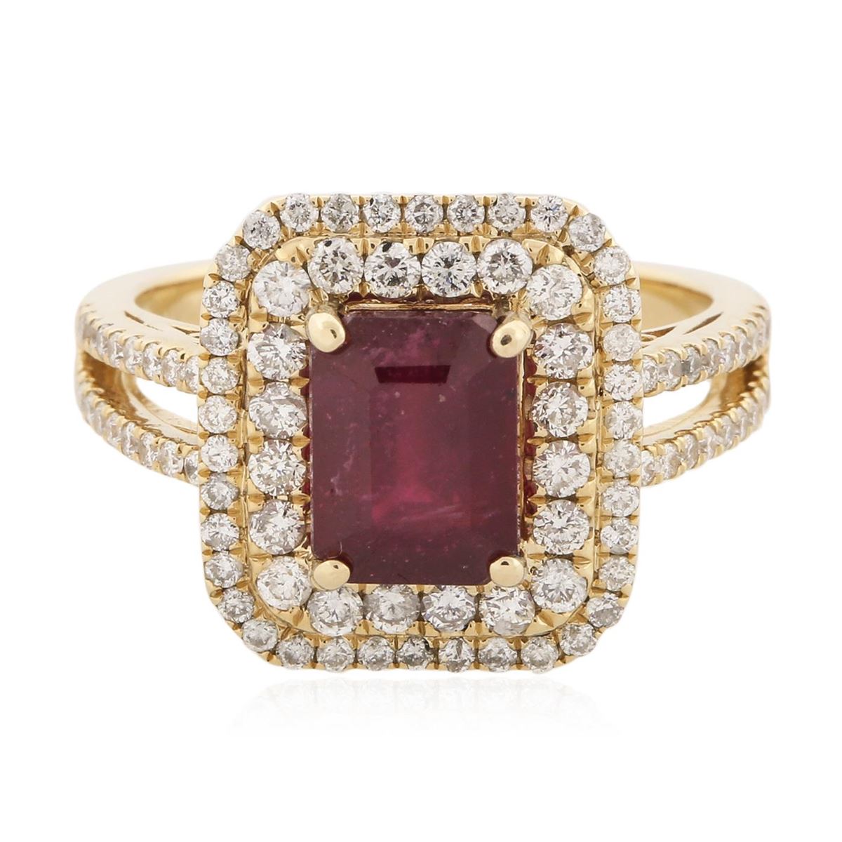One electronically tested 14KT yellow gold Ladies combination cast & assembled ring with a bright polish finish. Condition is new. Identified with markings of "14K". Containing: One prong set emerald standard step cut natural ruby, measuring 8.00 x 6.00 x 3.43mm, approximate weight of 3.06ct., clarity is heavily included, type II, cut is good. Colored gemstones are presumed to have been subjected to commonly used color/clarity enhancement processes. Ninety-Seven prong set round brilliant cut diamonds, measuring 1.60 - 1.20 x 0.84mm (depth est.) approximate. Total Weight of 97 Stones = 0.97ct. Clarity: SI-2 to I-1. Color: J, Cut is Good. Total Weight of Colored Stones 3.06ct. Total Weight of Diamonds 0.97ct. Total Weight of Ring 5.90 grams. GGL Appraised at $5,285.00.