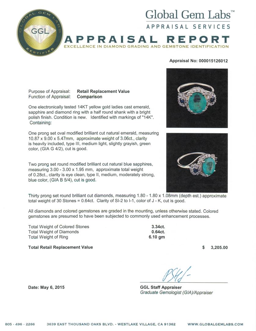 One electronically tested 14KT yellow gold ladies cast emerald, sapphire and diamond ring with a half round shank with a bright polish finish. Identified with markings of "14K". Condition is new. Containing: One prong set oval modified brilliant cut natural emerald, measuring 10.87 x 9.00 x 5.47mm, approximate weight of 3.06ct., clarity is heavily included, type III, medium light, slightly grayish, green color, (GIA G 4/2), cut is good. Two prong set round modified brilliant cut natural blue sapphires, measuring 3.00 - 3.00 x 1.95 mm, approximate total weight of 0.28ct., clarity is eye clean, type II, medium, moderately strong, blue color, (GIA B 5/4), cut is good. Thirty prong set round brilliant cut diamonds, measuring 1.80 - 1.80 x 1.08mm (depth est.) approximate total weight of 30 Stones = 0.64ct. Clarity: SI-2 to I-1. Color: J - K, Cut is Good. All diamonds and colored gemstones are graded in the mounting, unless otherwise stated. Colored gemstones are presumed to have been subjected to commonly used enhancement processes.. Total Weight of Colored Stones 3.34ct. Total Weight of Diamonds 0.64ct. Total Weight of Ring 6.10 grams. GGL Appraised at $3,205.00.