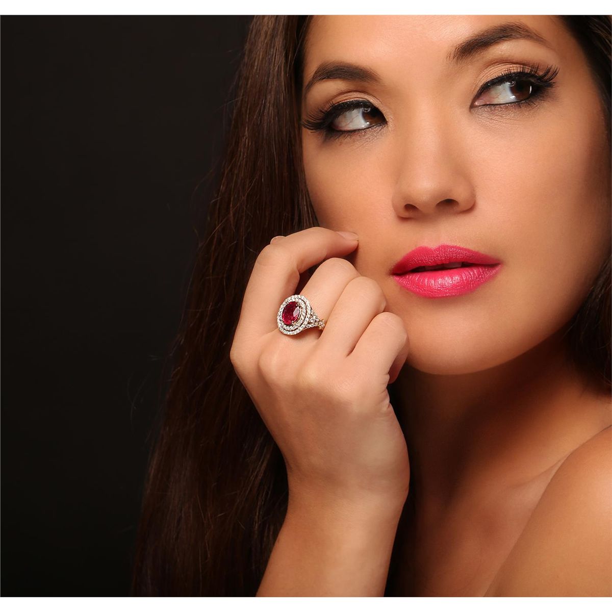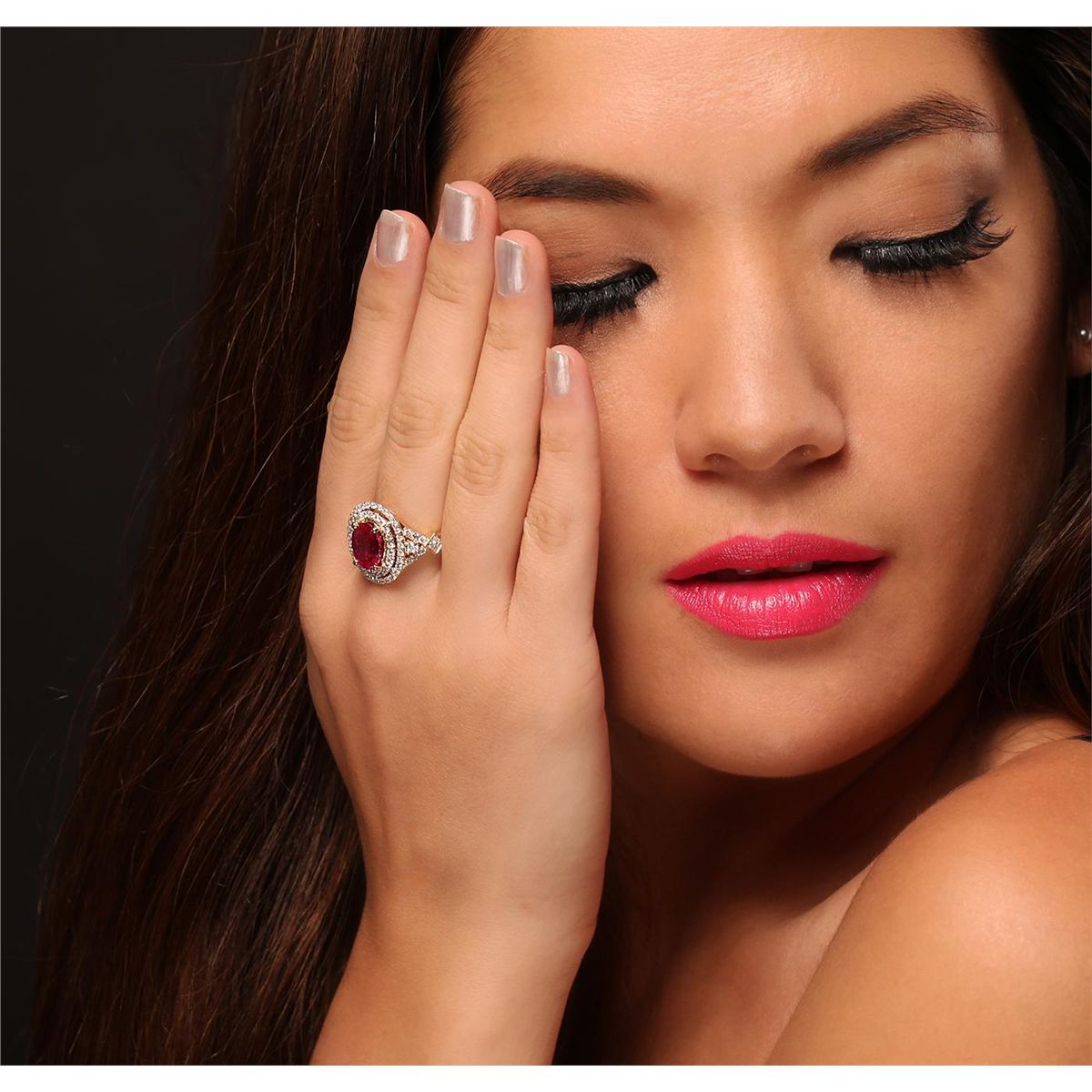 One electronically tested 14KT yellow gold Ladies combination cast & assembled ring with a bright polish finish. Condition is new. Identified with markings of "14K". Containing: One prong set oval modified brilliant cut natural ruby, measuring 10.00 x 8.00 x 4.10mm, approximate weight of 3.06ct., clarity is heavily included, medium dark, moderately strong, purple red color, (GIA PR 6/4), cut is good. Colored gemstones are presumed to have been subjected to commonly used color/clarity enhancement processes. Two prong set round brilliant cut diamonds, measuring 2.40 - 2.40 x 1.44mm (depth est.) approximate. Total Weight of 2 Stones = 0.10ct. Clarity: SI-2 to I-1. Color: I - J, Cut is Good. Eight prong set round brilliant cut diamonds, measuring 1.00 - 1.00 x 0.60mm (depth est.) approximate. Total Weight of 8 Stones = 0.06ct. Clarity: I-1. Color: I - J, Cut is Good. Sixty-Four prong set round brilliant cut diamonds, measuring 1.50 - 1.50 x 0.90mm (depth est.) approximate. Total Weight of 64 Stones = 1.03ct. Clarity: I-1 to I-2. Color: J, Cut is Good. Total Weight of Colored Stones 3.06ct. Total Weight of Diamonds 1.19ct. Total Weight of Ring 5.80 grams. GGL Appraised at $6,125.00.