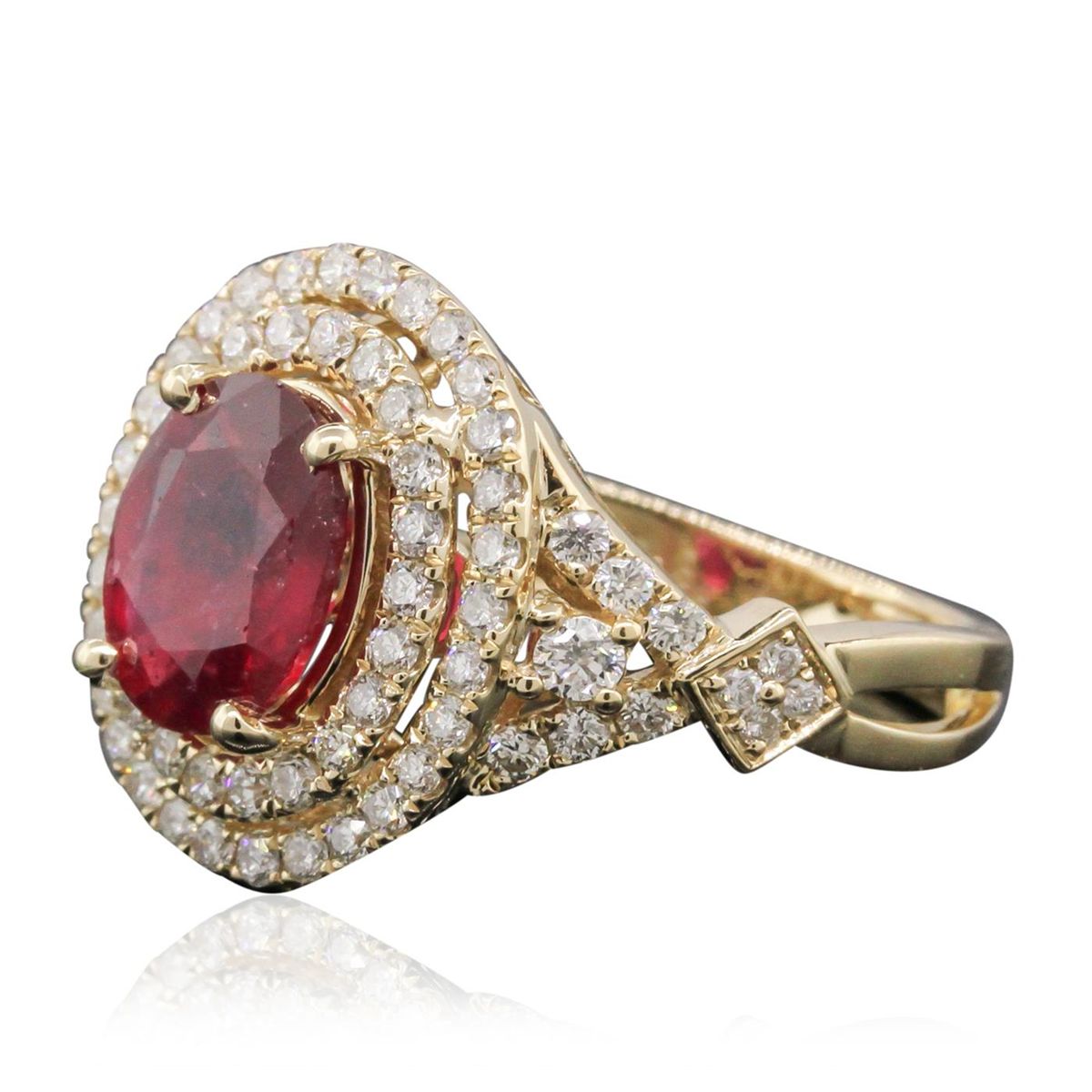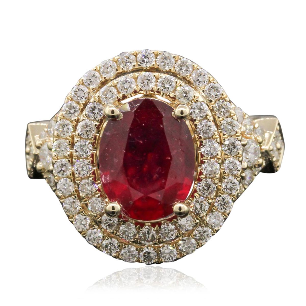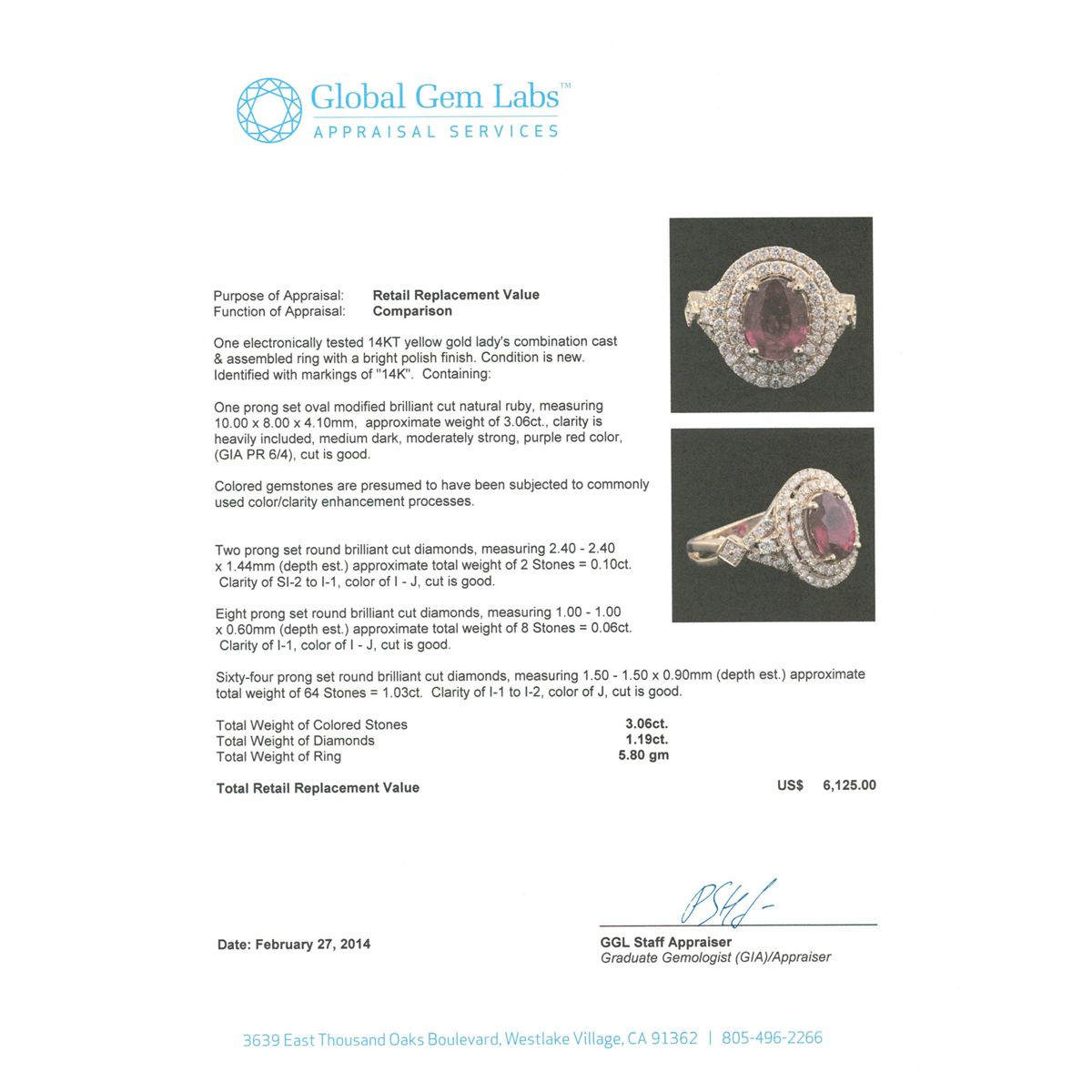One electronically tested 14KT yellow gold Ladies combination cast & assembled ring with a bright polish finish. Condition is new. Identified with markings of "14K". Containing: One prong set oval modified brilliant cut natural ruby, measuring 10.00 x 8.00 x 4.10mm, approximate weight of 3.06ct., clarity is heavily included, medium dark, moderately strong, purple red color, (GIA PR 6/4), cut is good. Colored gemstones are presumed to have been subjected to commonly used color/clarity enhancement processes. Two prong set round brilliant cut diamonds, measuring 2.40 - 2.40 x 1.44mm (depth est.) approximate. Total Weight of 2 Stones = 0.10ct. Clarity: SI-2 to I-1. Color: I - J, Cut is Good. Eight prong set round brilliant cut diamonds, measuring 1.00 - 1.00 x 0.60mm (depth est.) approximate. Total Weight of 8 Stones = 0.06ct. Clarity: I-1. Color: I - J, Cut is Good. Sixty-Four prong set round brilliant cut diamonds, measuring 1.50 - 1.50 x 0.90mm (depth est.) approximate. Total Weight of 64 Stones = 1.03ct. Clarity: I-1 to I-2. Color: J, Cut is Good. Total Weight of Colored Stones 3.06ct. Total Weight of Diamonds 1.19ct. Total Weight of Ring 5.80 grams. GGL Appraised at $6,125.00.