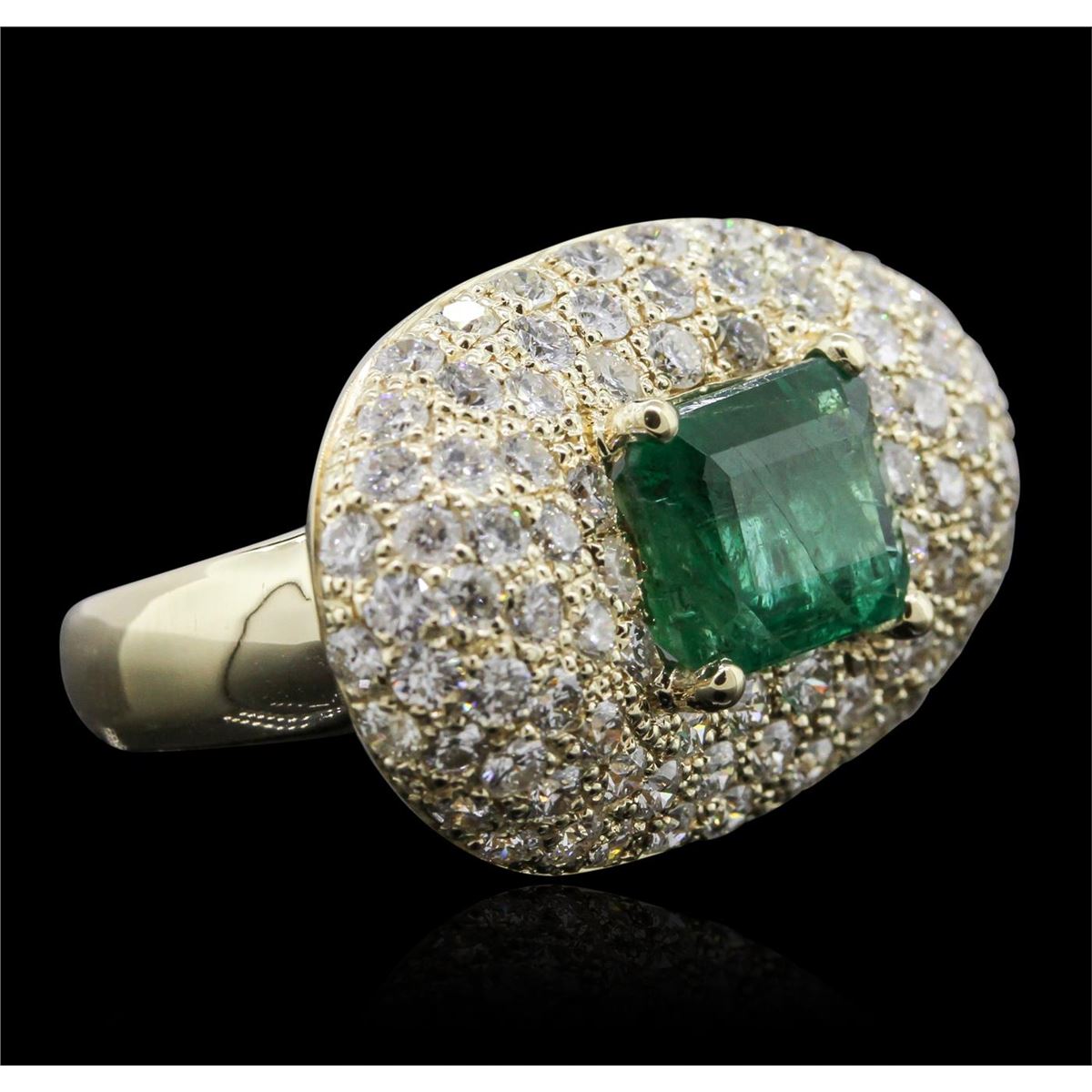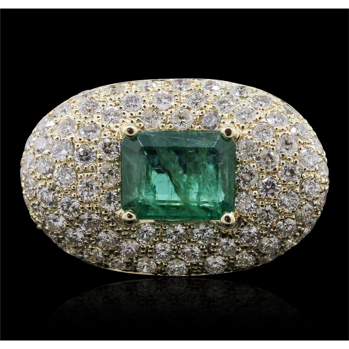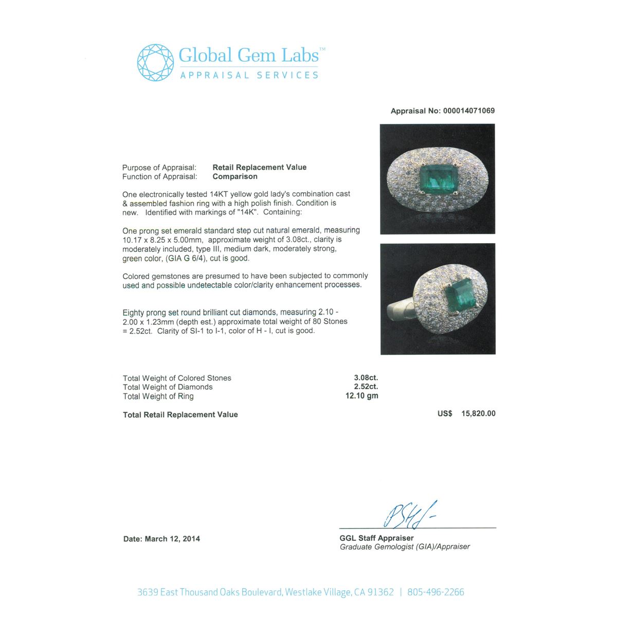 One electronically tested 14KT yellow gold Ladies combination cast & assembled fashion ring with a high polish finish. Condition is new. Identified with markings of "14K". Containing: One prong set emerald standard step cut natural emerald, measuring 10.17 x 8.25 x 5.00mm, approximate weight of 3.08ct., clarity is moderately included, type III, medium dark, moderately strong, green color, (GIA G 6/4), cut is good. Colored gemstones are presumed to have been subjected to commonly used and possible undetectable color/clarity enhancement processes. Eighty prong set round brilliant cut diamonds, measuring 2.10 - 2.00 x 1.23mm (depth est.) approximate total weight of 80 Stones = 2.52ct. Clarity of SI-1 to I-1, Color of H - I, Cut is Good. Total Weight of Colored Stones 3.08ct. Total Weight of Diamonds 2.52ct. Total Weight of Ring 12.10 grams. GGL Appraised at $15,820.00.