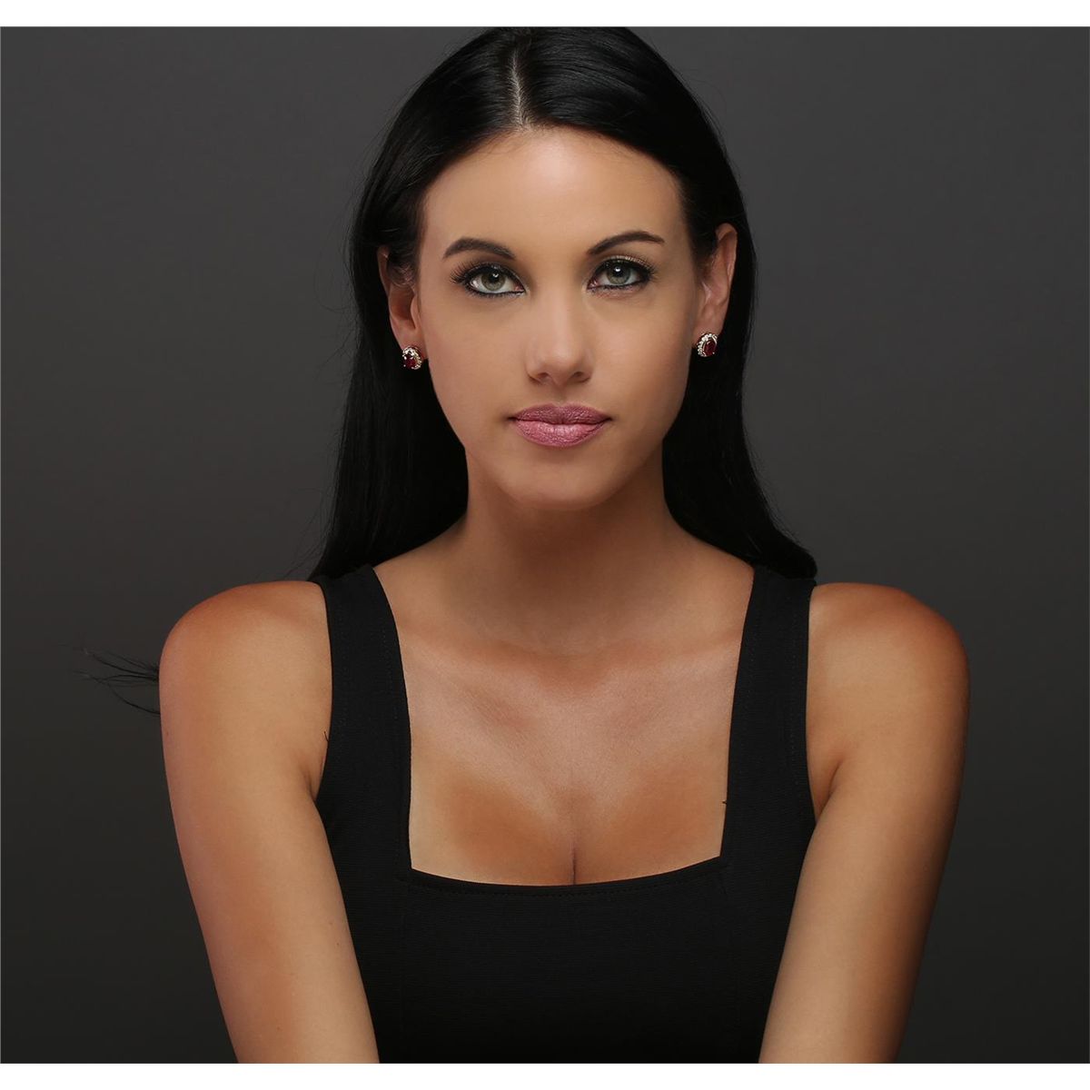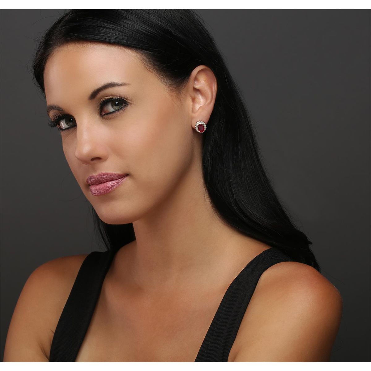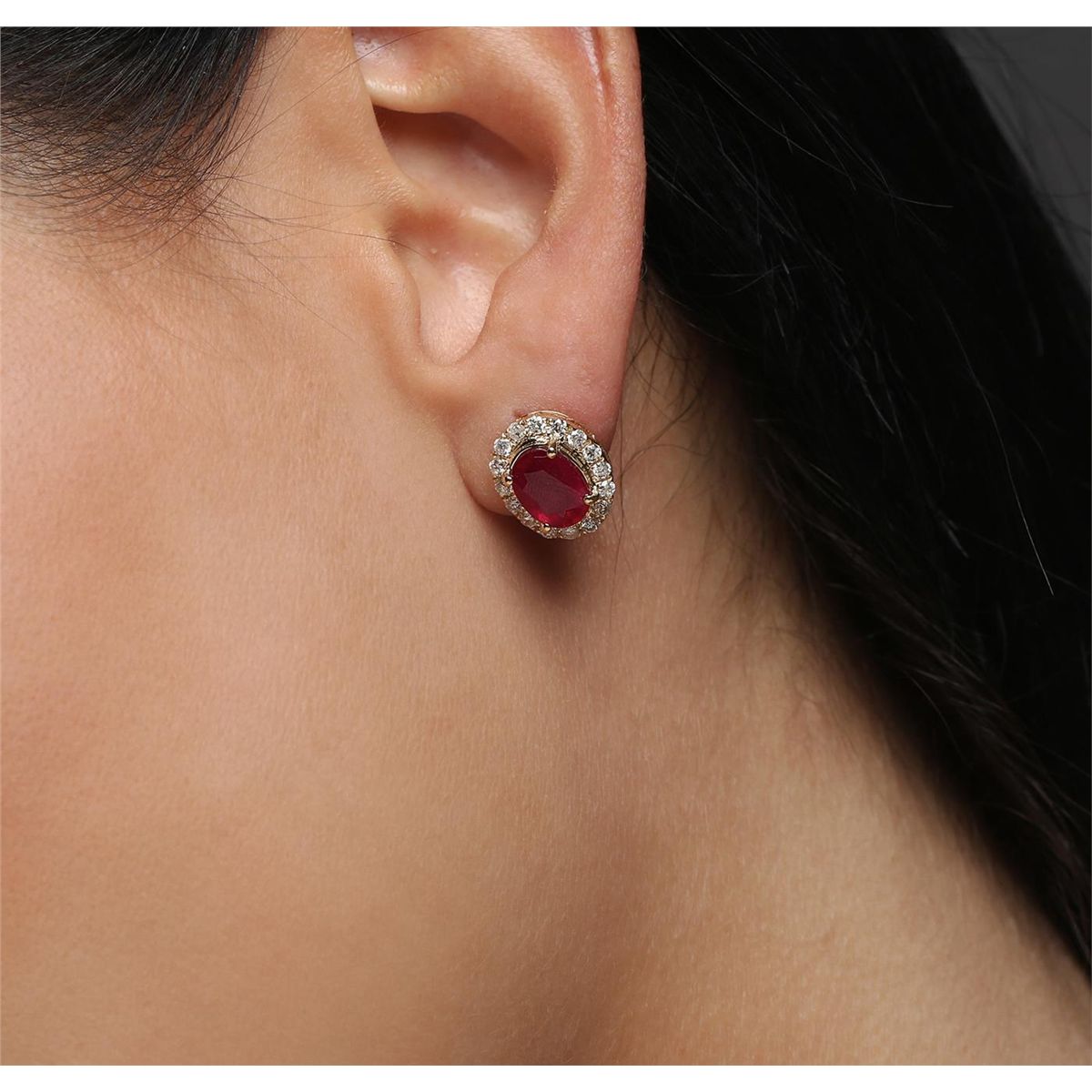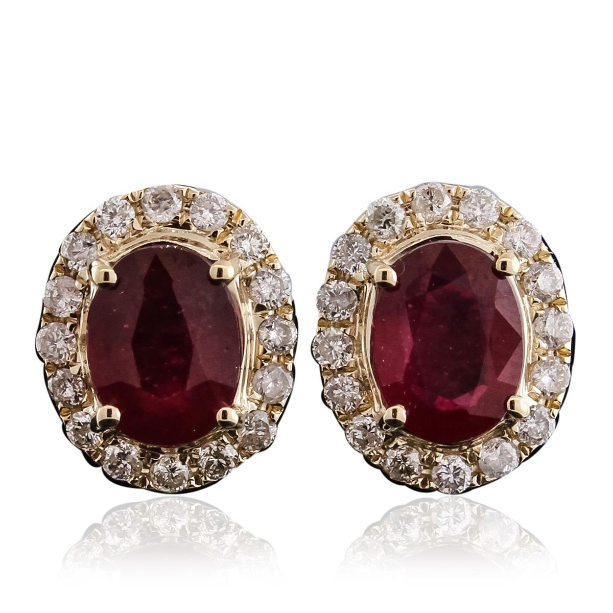 One electronically tested 14KT yellow gold ladies cast & assembled ruby & diamond earrings with standard backs. Each earring features a ruby set within a diamond bezel. Trademark is Orianne. Identified with markings of "14K". Condition is good. Containing: Two prong set oval mixed cut natural rubies, measuring 8.00 x 6.00 x 3.78mm, 4% bulge factor, approximate total weight of 3.08ct., clarity is heavily included, type II, dark, very slightly brownish, red color, (GIA R 7/3), cut is good. Transmitting light somewhat diffusely, translucent. Naturally occurring internal & external characteristics are present. Indications of laboratory high temperature heat treatment, with glass & flux additives. Ruby has a low tolerance to rhodium plating, repolishing the surface, & ultrasonic cleaning. Graded in the setting. Thirty-Two prong set round brilliant cut diamonds, measuring 1.80 - 1.70 x 1.05mm (depth est.) approximate total weight of 32 Stones = 0.62ct. Graded in the setting. Clarity: I-1 to I-2. Color: H - J. Total Weight of Colored Stones 3.08ct. Total Weight of Diamonds 0.62ct. Total Weight of Earrings 3.90gm. AIG Appraised at $2,390.00.