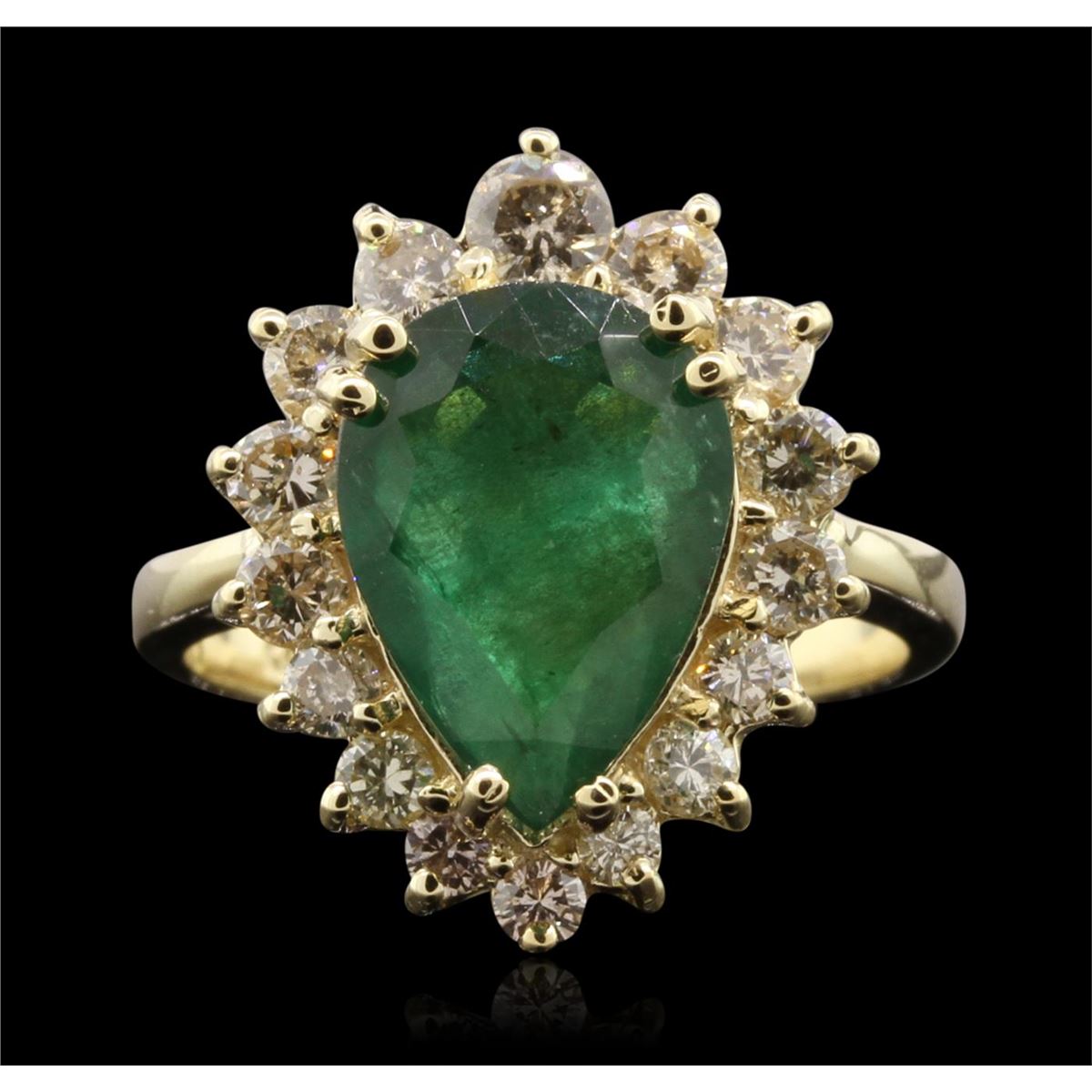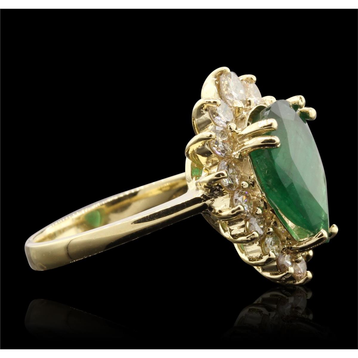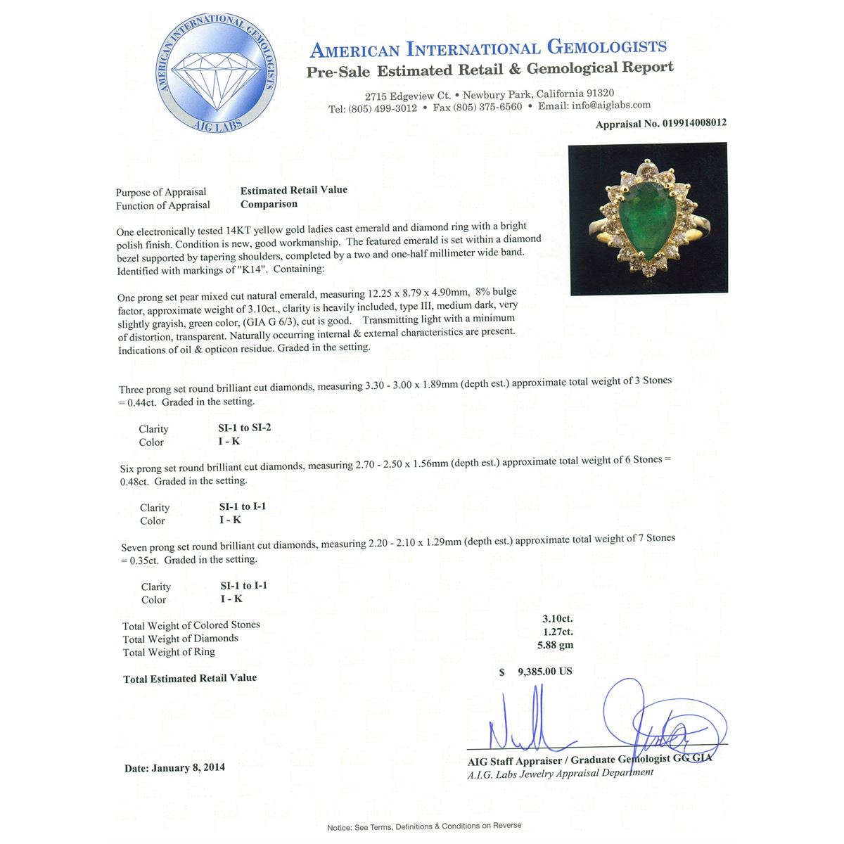 One electronically tested 14KT yellow gold ladies cast emerald and diamond ring with a bright polish finish. The featured emerald is set within a diamond bezel supported by tapering shoulders, completed by a two and one-half millimeter wide band. Identified with markings of "K14". Condition is new, good workmanship. Containing: One prong set pear mixed cut natural emerald, measuring 12.25 x 8.79 x 4.90mm, 8%. bulge factor, approximate weight of 3.10ct., clarity is heavily included, type III, medium dark, very slightly grayish, green color, (GIA G 6/3), cut is good. Transmitting light with a minimum of distortion, transparent. Naturally occurring internal & external characteristics are present. Indications of oil & opticon residue. Graded in the setting. Three prong set round brilliant cut diamonds, measuring 3.30 - 3.00 x 1.89mm (depth est.) approximate. Total Weight of 3 Stones = 0.44ct. Graded in the setting. Clarity: SI-1 to SI-2 . Color: I - K Six prong set round brilliant cut diamonds, measuring 2.70 - 2.50 x 1.56mm (depth est.) approximate. Total Weight of 6 Stones = 0.48ct. Graded in the setting. Clarity: SI-1 to I-1 . Color: I - K Seven prong set round brilliant cut diamonds, measuring 2.20 - 2.10 x 1.29mm (depth est.) approximate. Total Weight of 7 Stones = 0.35ct. Graded in the setting. Clarity: SI-1 to I-1 . Color: I - K. Total Weight of Colored Stones 3.10ct. Total Weight of Diamonds 1.27ct. AIG Appraised at $9,385.00.